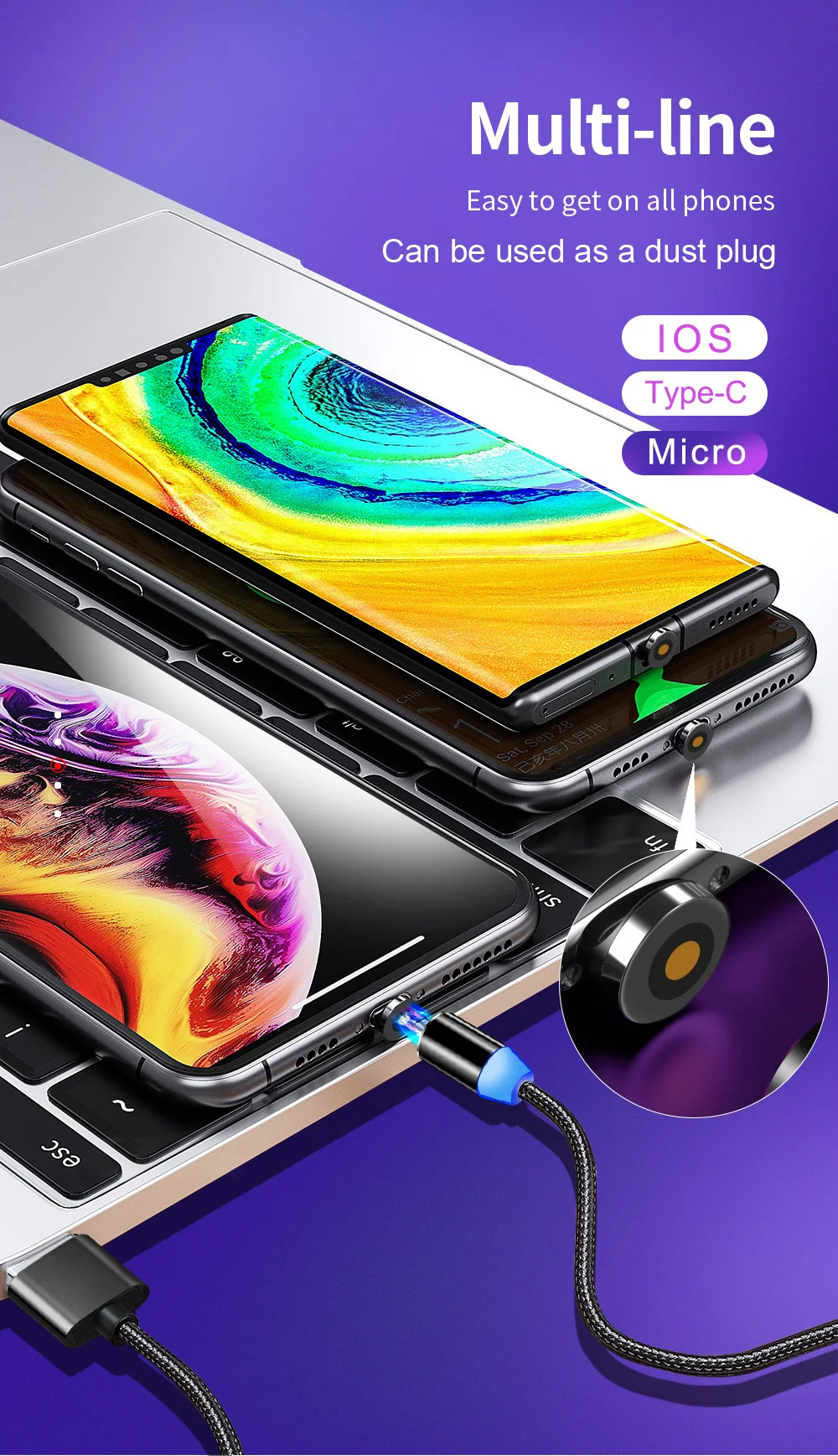 Длина: 1 м (3,28 фута) 2 м (6,56 фута)Выход: 5 В/2,4 А (макс.)● Магнитный дизайнСделайте ваш опыт лучшим способом зарядки телефона● Светодиодный индикаторВстроенный синий светодиодный индикатор горит при активном кабеле● Ультра прочныйМеталлический порт + нейлоновая оплетка, делает изделие прочным и устойчивым к переплетению и запутыванию.● Легко заряжатьВилка отделена от кабеля. Разъем может оставаться на телефоне, только 1 секунда подключена к зарядке.● Пылезащитная вилкаМагнитный разъем может быть пыленепроницаемой вилкой и продлить срок службы вашего устройства. Кроме того, он может уменьшить повреждение вашего usb-порта, предотвращая частое подключение и вытягивание.Советы:Этот кабель предназначен только для зарядки, а не для передачи данных.