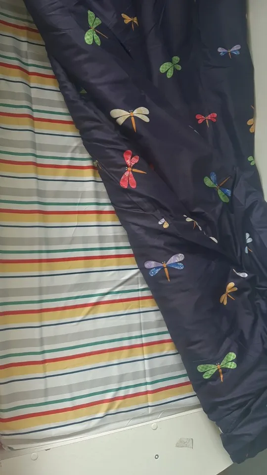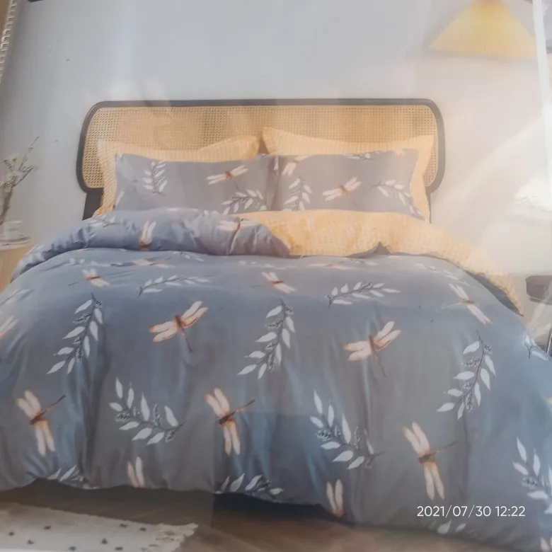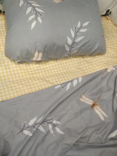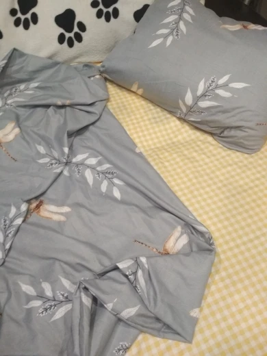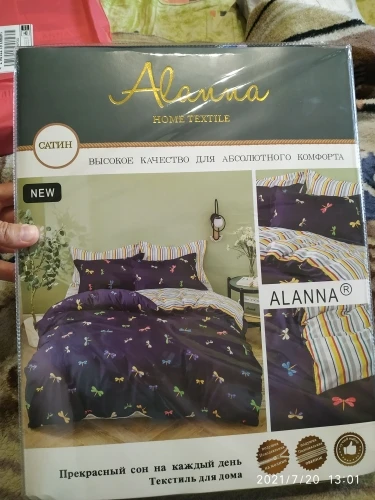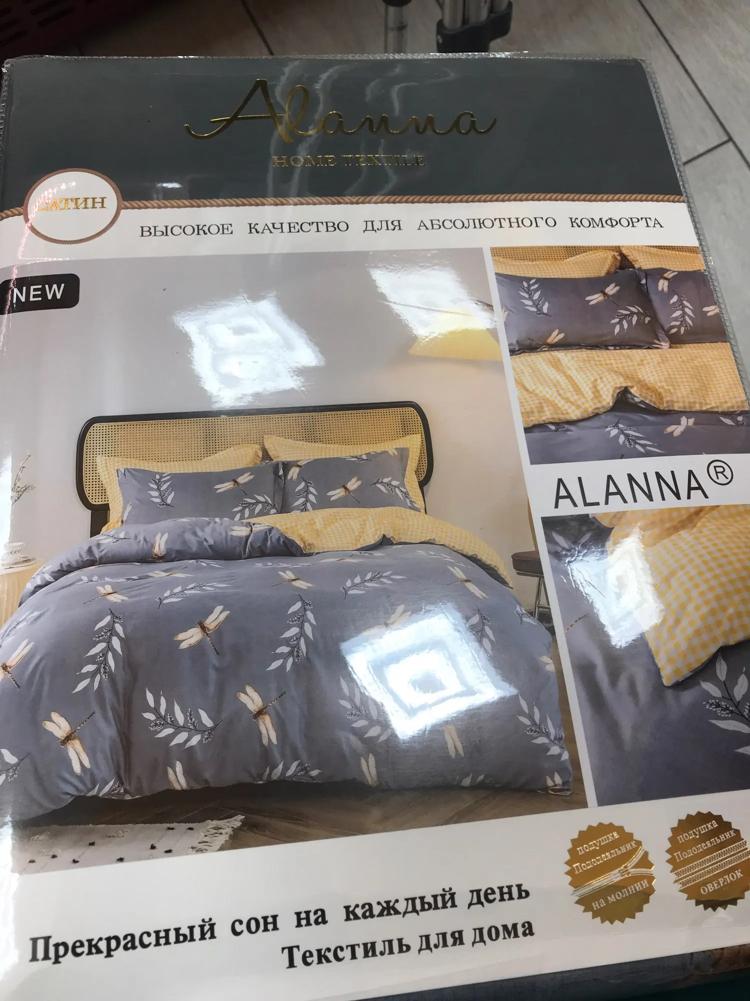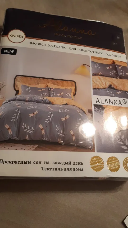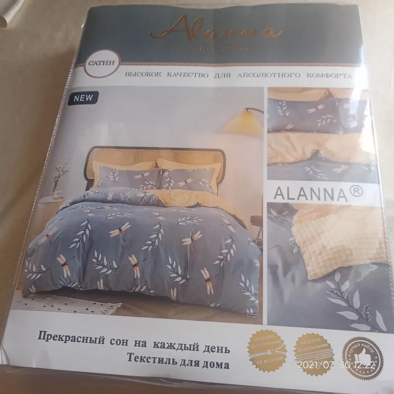 Ещё один комплект от Аланны. Комплект из приятной к телу ткани. Расцветка летне-спокойная. Пошито хорошо. Есть отличия от фото: все наволочки из серой ткани со стрекозами, пододеяльник с обеих сторон из одинаковой ткани. То есть не так как на фото, где 2 наволочки из серого материала, 2 из желто-белого, где пододеяльник с одной стороны серый, со второй жёлтый. Мне лично эти отличия не принципиальны, а кому важно, чтоб как на фото, лучше пообщаться с продавцом перед заказом. После стирки цвет белья не изменился. Доставка почтой России. Отслеживалась посылка до места вручения.