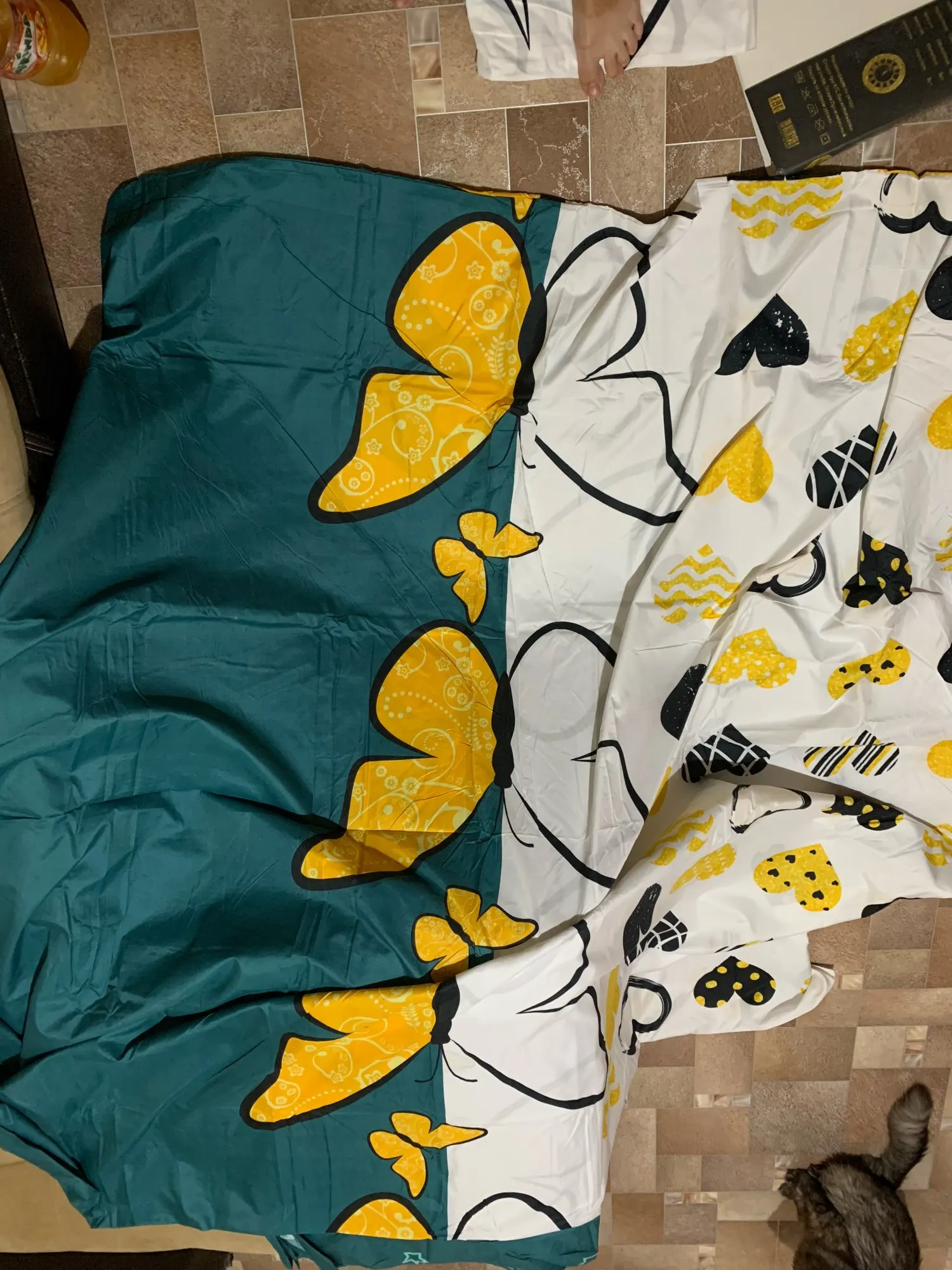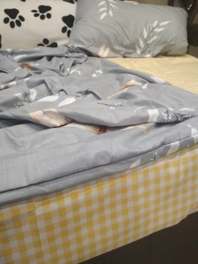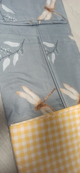 Почему то у этого комплекта простынь только желтая, больше нет нигде желтых вставок, поэтому минус одна звезда. Видимо мне попался брак, на фото должен пододеяльник с одной стороны тоже желтый, дополнительные 2 наволочки тоже должны быть желтые, в итоге все серое, кроме простыни. Само Качество хорошее, за такую цену у нас комплект евро купишь только в плохом качестве.