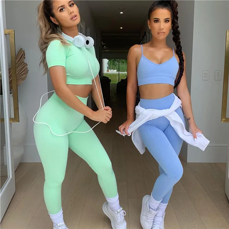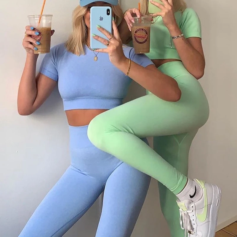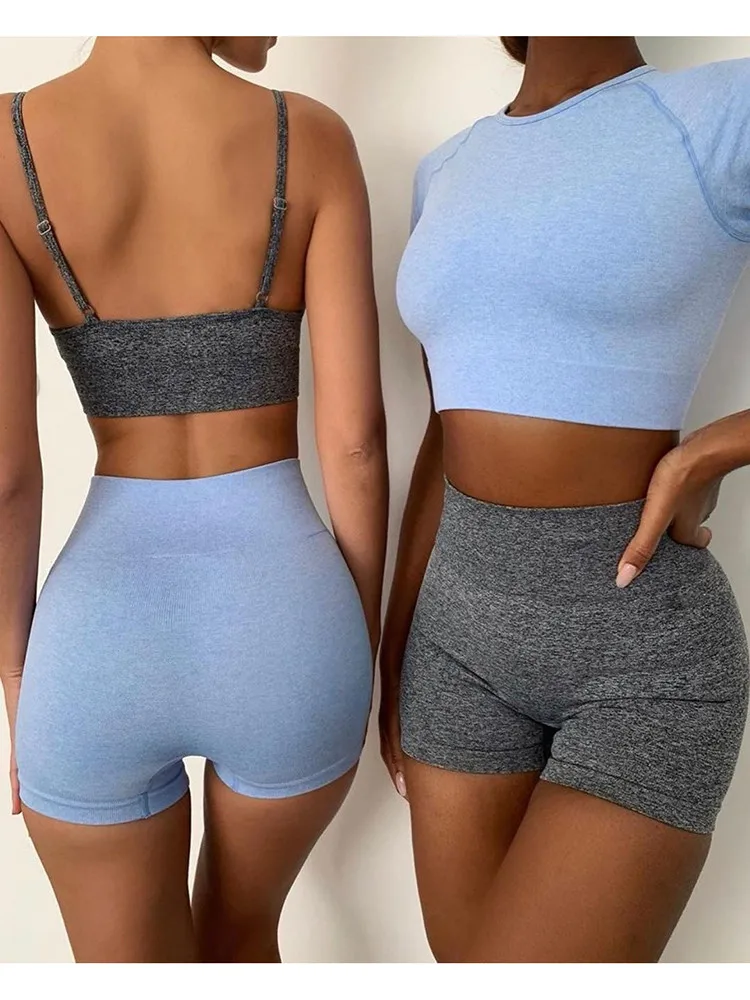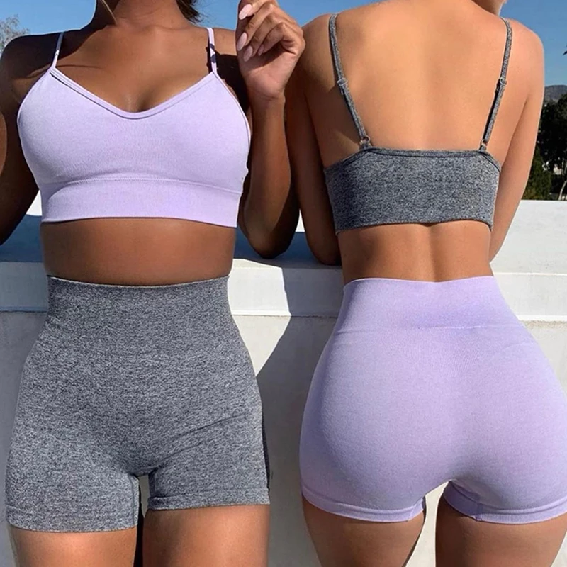 Летний бесшовный комплект с шортами, женский спортивный костюм, спортивная одежда для фитнеса, тренировок, короткий топ, спортивный бюстгальтер, велосипедные шорты, леггинсы с высокой талией