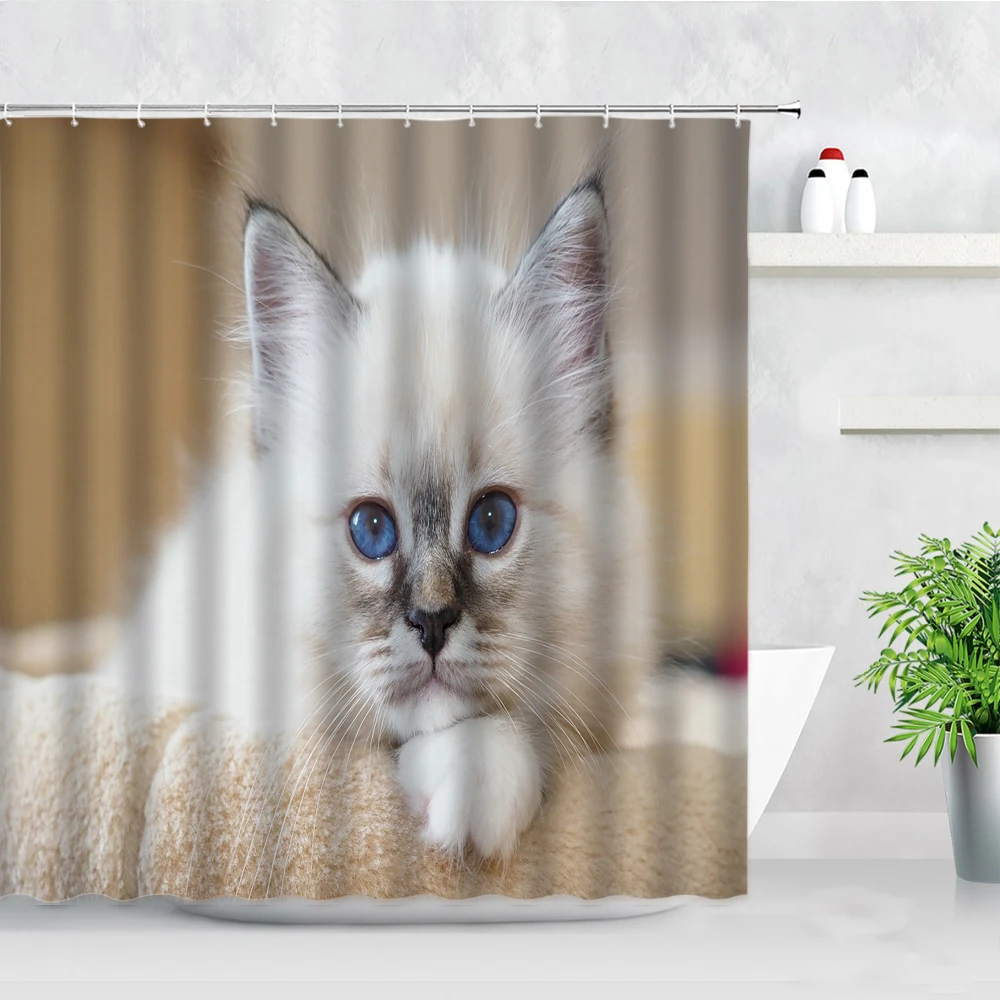 Занавеска для душа, белая, водонепроницаемая, с рисунком кота, с кр...