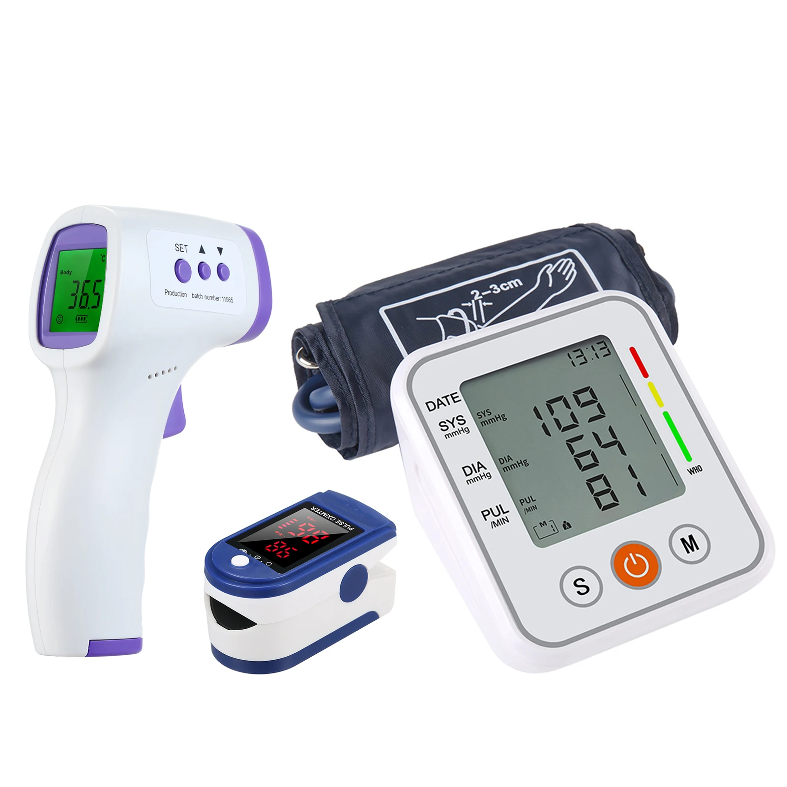 Монитор артериального давления + Бесконтактный инфракрасный термометр + Монитор кислорода в крови-- Монитор артериального давленияЭлектронный сфимоманометр верхней руки, который помогает следить за здоровьем родителей.Особенности:С/без функции голосовой трансляции для вашего выбора. Функция голосового вещания, легко распознает, избавьтесь от дальнозорких очков.ЖК-дисплей с большим экраном четко виден, благоприятный для пожилых людей.Одна кнопка для автоматического запуска измерения без повторной работы.Двойная память позволяет родителям хранить данные отдельно.Интеллектуальное повышение делает измерение артериального давления удобным и правильным.Снижает частоту сердечных заболеваний и обеспечивает защиту здоровья.Отображает три последних средних измерения.Маленький, легко носить с собой, обратите внимание на здоровье в любое время и в любом месте.Стиль наручных манжет, более аккуурат, потому что верхняя рука ближе к сердцу, чем запястье.Автоматическое выключение в течение 60 секунд для экономии заряда батареи.Использование шагов:1. Расслабьтесь и выпрямите руку2. Оберните наручный ремешок вокруг руки3. Для крепления с тканевой пряжкой4. Подождите и посмотрите результаты тестированияХарактеристики:Тип: с голосовой передачей/без голосовой трансляции (опционально)Цвет: белыйМатериал: АБС-пластик + ПоликарбонатИзмерительный позиции: верхний рычаг (22-32 см/8,7-12.6in)Диапазон измерения: кровяное давление 0mmHg-280mmHg (0kpa-37,3kpa), Частота пульса 40/min-195/минТочность: Артериальное Давление ± 0,4кпа (± 3 мм рт. Ст.), Частота пульса ± 5%Объем хранения: 2 человека 99 наборов данных измеренийРабочая среда: 10 ℃-40 ℃, 40%-85% RHСреда хранения: -20 ℃ ~ 50 ℃, 15%-90% RHПитание: 4*1,5 V элемент питания AAА (в комплект не входит)Автоматическое выключение: около 60 сРазмер экрана: 65,7*60 мм/2,6 * 2.4inРазмер изделия: 125*100*70 мм/4,9*3,9*2,8 дюймовВес изделия: 236 г/8,3 унцийПосылка Размеры: 11*10*16,5 см/4,3*3,9 * 6.5inВес посылка: 450 г/15,9 унцийПосылка:1 * Монитор артериального давления1 * ремешок на руку1 * сумка для хранения1 * Руководство пользователя-- Бесконтактный инфракрасный термометрЭто Инфракрасный цифровой термометр для лба с высокой точностью, который ручной и портативный для удобства использования. Бесконтактный дизайн эффективно уменьшает перекрестную инфекцию, широко используется для измерения температуры тела. Многоцелевой, он также может быть использован для измерения температуры поверхности объектов. Встроенный высокоскоростной датчик, высокая точность, быстрый результат отображения, не нужно ждать.Особенности:Высокоточный инфракрасный датчик, стабильный и надежный, для безопасного использования, обеспечивает точное измерение, небольшие ошибки.Температура сигнализации может быть установлена и после превышения, это даст звуковой сигнал. По умолчанию температура сигнализации составляет 38 ℃.Большое ЖК-дисплей цифровой дисплей с 3-цветной высокой яркости подсветки может четко показывать температуру и соотношение цена/качество.Вы можете выбрать режим температуры поверхности объекта и режим измерения температуры тела в соответствии с вашими потребностями.Направьте на лоб, без контакта, нажмите кнопку измерения, и ЖК-дисплей покажет измеренную в настоящее время температуру.Автоматическое хранение 32 наборов данных измерений, вы можете просмотреть данные предыдущих измер