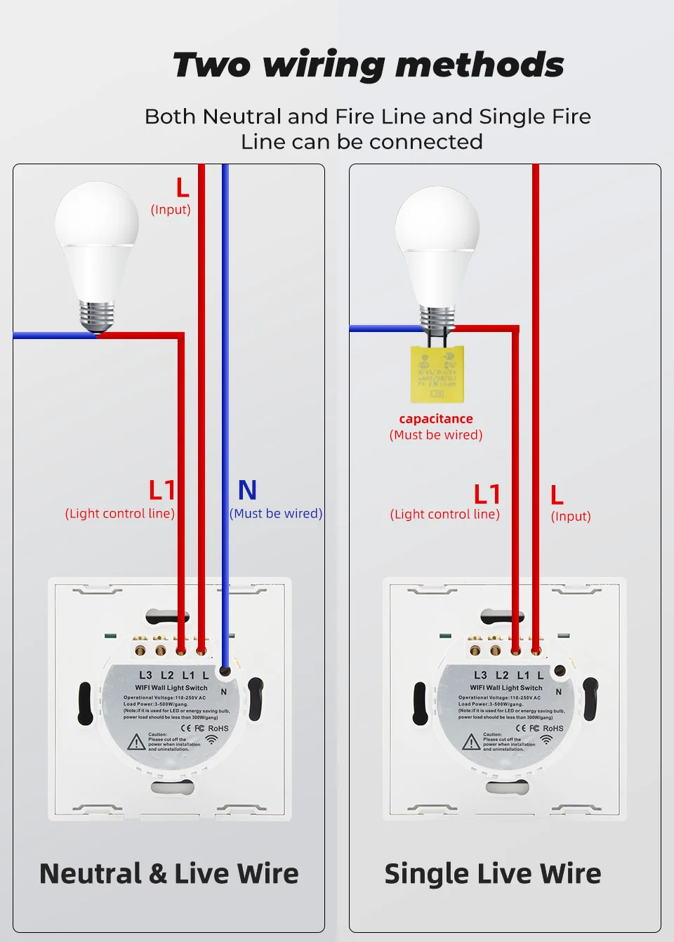 1. Нейтральный провод + live, покрытый вязальной проволокой (н/д) может поддерживать 2-полосная управления. (Он должен иметь нейтральную линию для достижения 2-way)2. Одиночный провод (L) (установочный конденсатор должен быть подключен к L и N лампы L1. Не за переключателем)