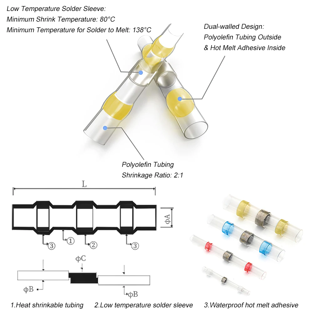 -- Коэффициент усадки 2:1 -- Простое одношаговое соединение проводов. -- Простая Идентификация: цветная соединительная трубка. -- Полиолефиновые термоусадочные стыковые разъемы улучшают прочность вытяжки. -- Высококачественные провода разъемы в уплотнение, деформация, проверка кабеля и изоляция. -- Плавленный припой обеспечивает прочное соединение проводов и позволяет избежать выскальзывания проводов из терминала.