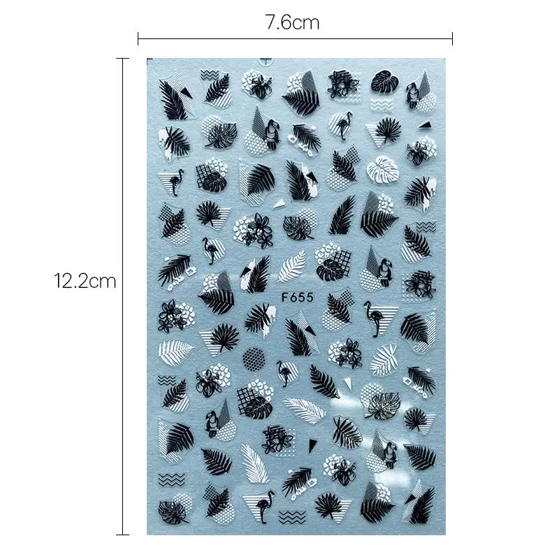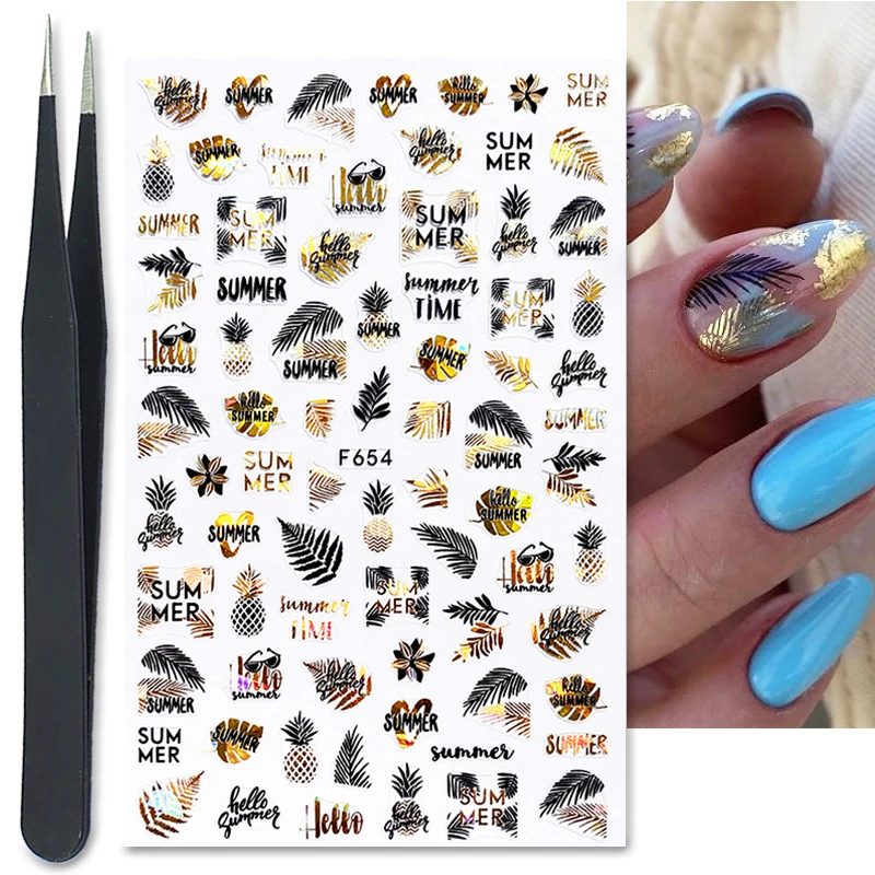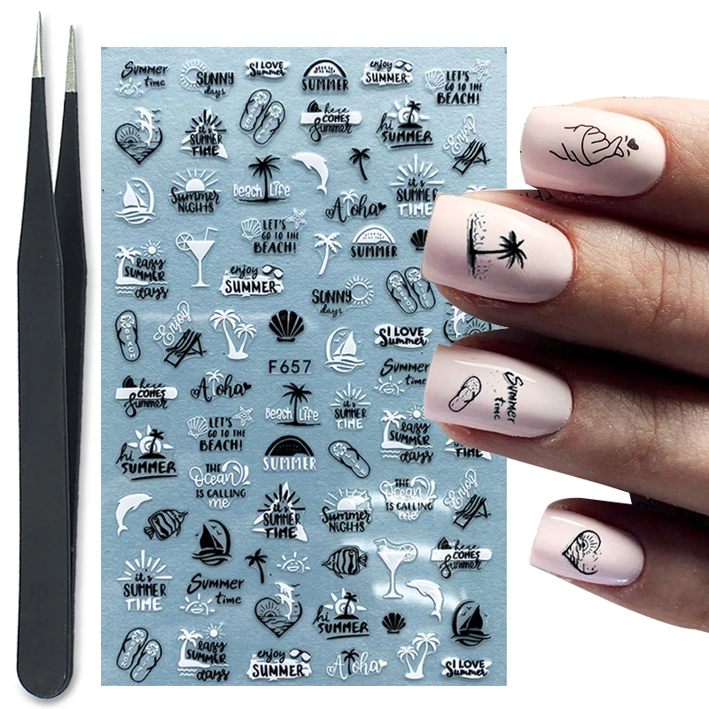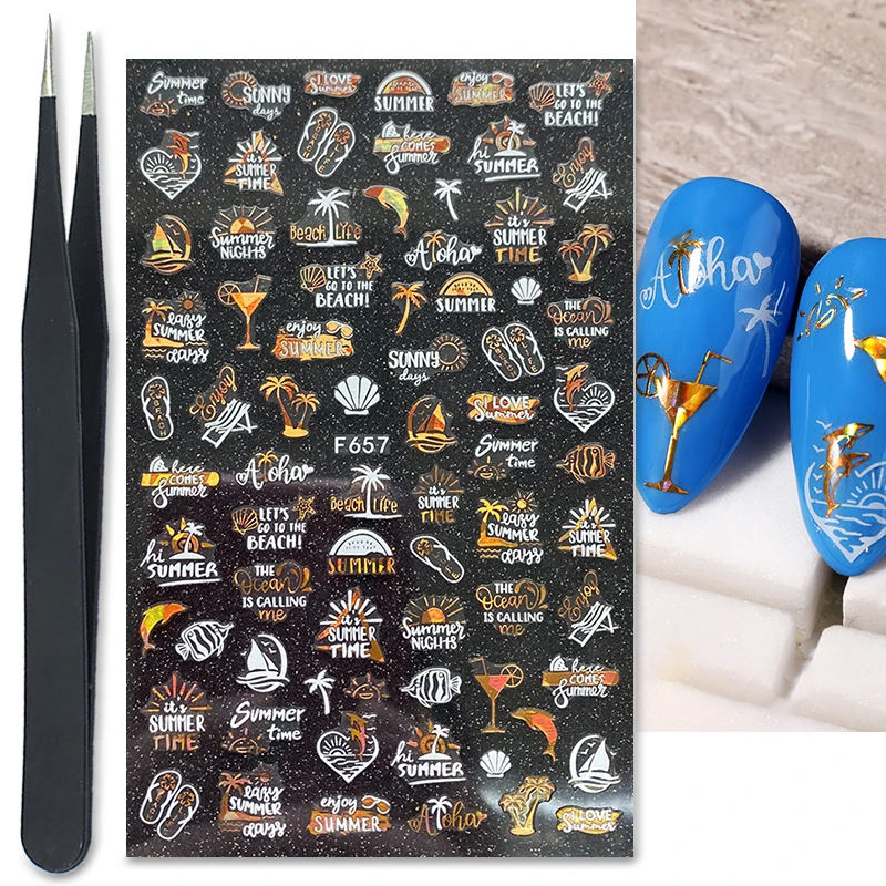 Бело-черные 3D наклейки для ногтей с пинцетом, набор золотых красивых листьев, переводные наклейки для ногтей, летние пляжные деревянные дельфины, слайдер