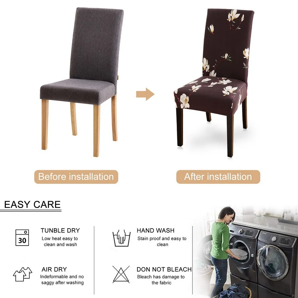 Особенности:Полиэстер спандекс. Мягкий материал, удобный и устойчивый к морщинкам, не требует глажки.Растягивающийся материал, растягивающийся, быстро восстанавливается, надежно прилегает к пришитой эластичной кромке.Машинная стирка, легко моется и моется.Привлекательный дизайн и красивый узор.Пусть ваш старый или уродливый стул будет выглядеть как новый и более красивый. Также может предотвратить царапины и укусы вашего стула.Его можно использовать в отеле, свадебном банкете, обеде, встрече, торжестве, церемонии, украшении семейной столовой и т. д.