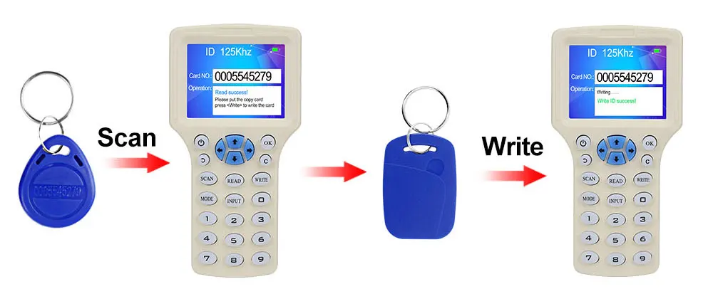1. Нажмите кнопку "ВКЛ/ВЫКЛ".2. Положите карты на заднюю часть копира. На копире появится страница «Waring». Нажмите «ок»3. Положите карты на заднюю сторону копира и нажмите кнопку "scan"4. Копир сканирует и показывает номер карты.5. Поместите одну записываемую T5577(125 кГц записываемый чип) или UID (13,56 МГц записываемый чип) карту на задней стороне копира и нажмите «написать»