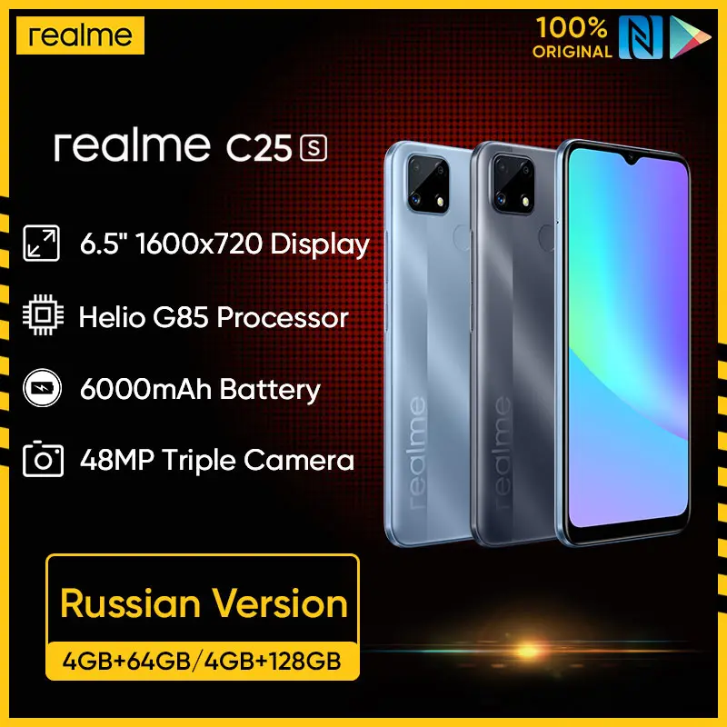 Сотовый телефон realme C25S, 4 Гб 64 ГБ4 ГБ 128 ГБ, русская версия, экран 6,5 дюйма, Восьмиядерный процессор Helio G85, Аккумулятор 6000 мАч, NFC