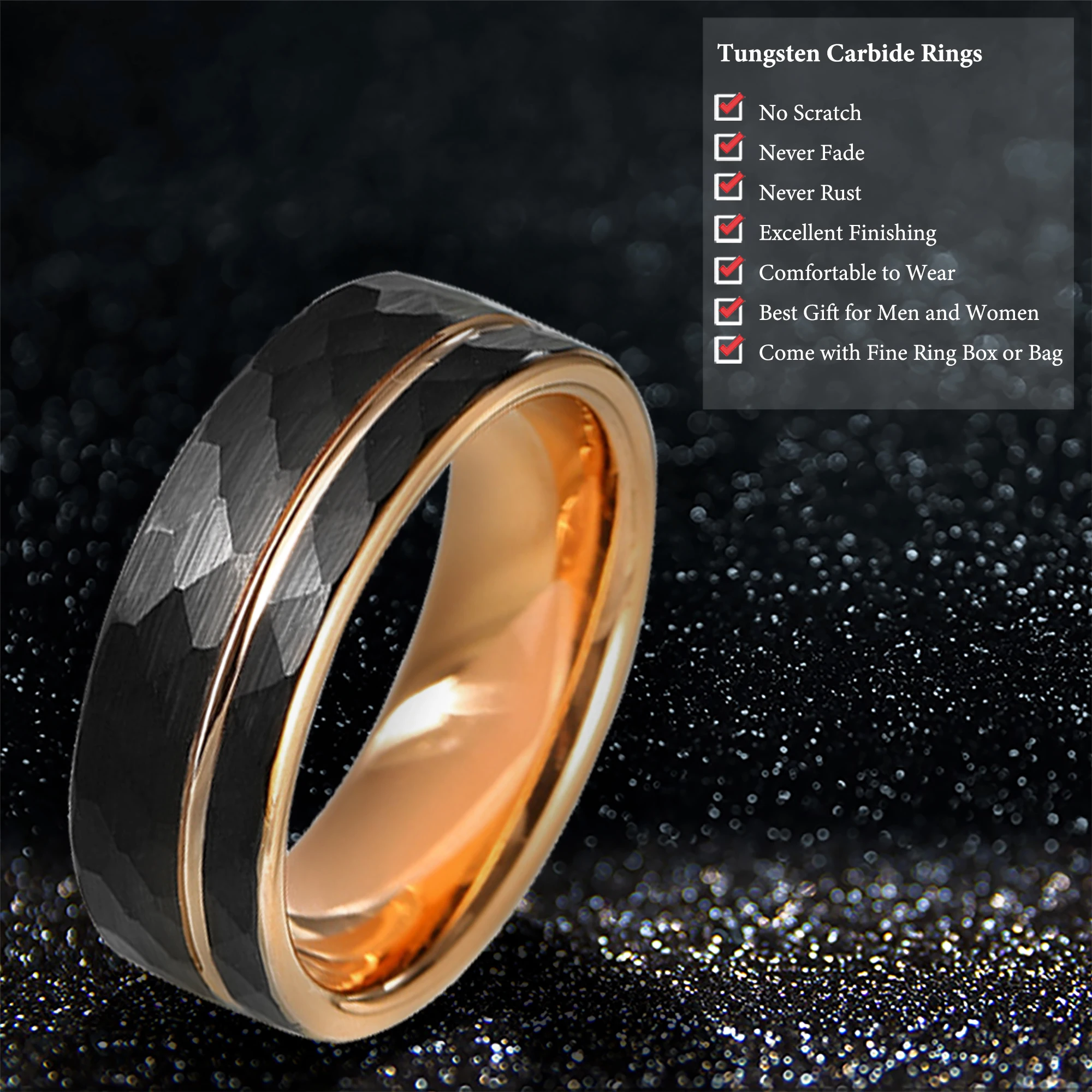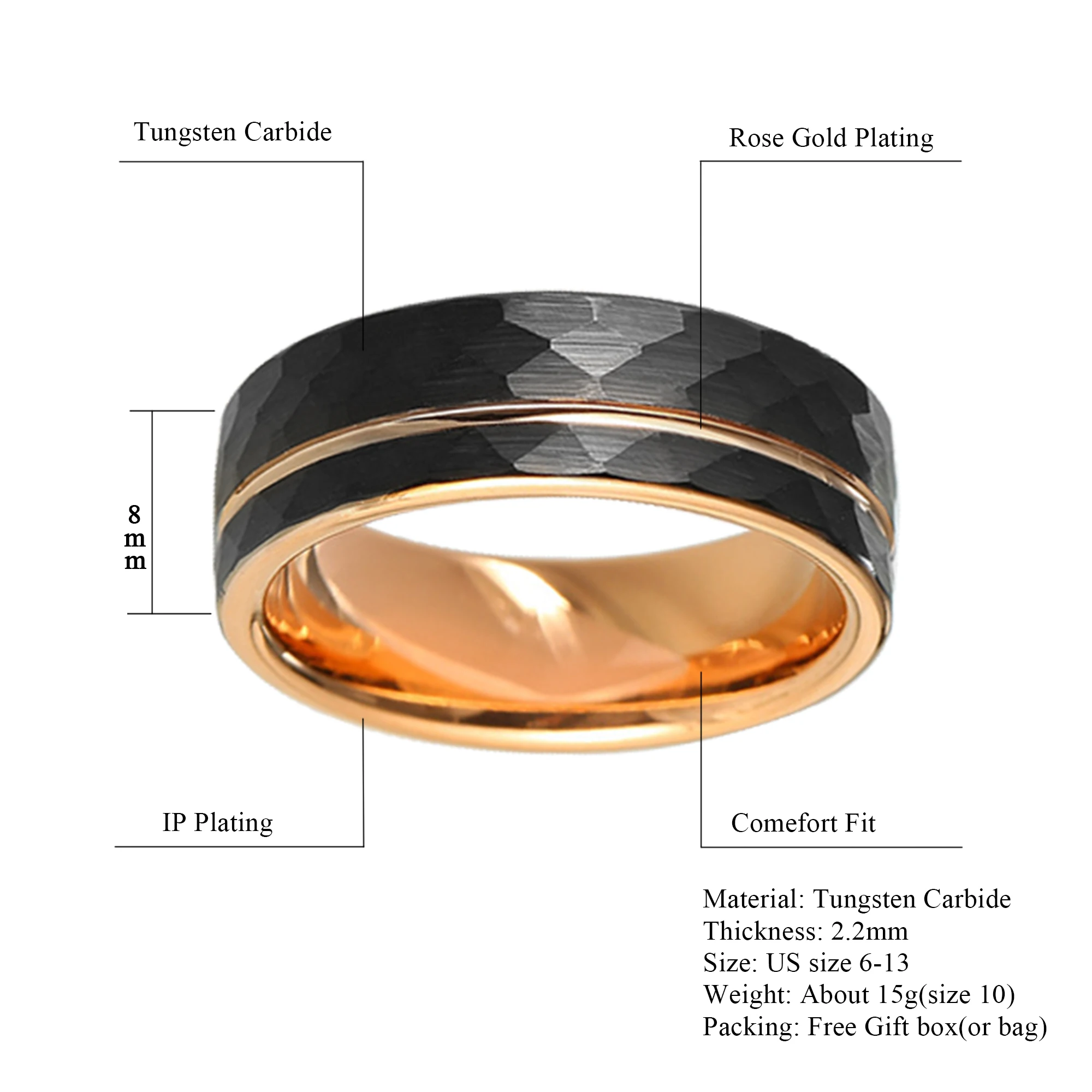Кольца вольфрамовые черные для пар, обручальные кольца 6 мм8 мм с гранями в виде молотка, матовые полоски из розового золота, для мужчин и женщин