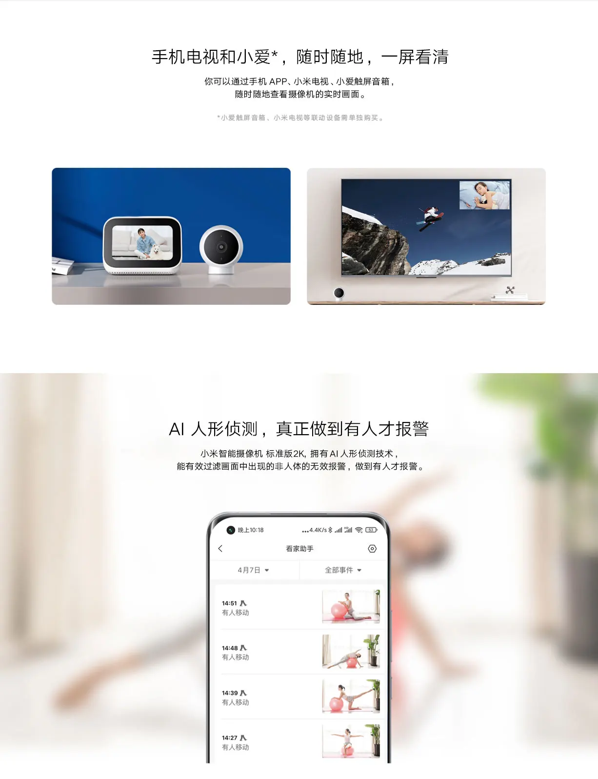 Основные характеристики: -2K Высокое разрешение Очень четкое разрешение 2304 × 1296 может показать больше деталей изображения. -940nm четкое ночное видение Встроенный инфракрасный заполняющий светильник 940nm, при включении отсутствует «Красный светильник», что обеспечивает беспроблемный сон для всей семьи. -Двустороннее аудио Поддерживает двухсторонние голосовые вызовы в режиме реального времени, делая их такими же гладкими, как личные звонки с семьей. Обновленный динамик делает звук более громким и четким. -Просмотр изображений в реальном времени в любое время и в любом месте Вы можете просматривать изображение камеры в реальном времени в любое время и в любом месте через мобильный телефон, Xiaomi TV, Xiaoai touch screen speaker. -AI гуманоидное Обнаружение С технологией обнаружения AI humanoid, он может эффективно фильтровать нечеловеческие тела на экране и уменьшить недействительные сигналы тревоги. -Магнитное основание с вращением на 180 градусов Его можно легко разместить дома, в магазине, возле кроватки или клетки для домашних животных. Магнитное основание и Прикрепленный металлический стикер также делают установку более удобной и простой, адаптируясь к различным вариантам установки. -Тройное шифрование для защиты конфиденциальности Поддерживает два способа хранения: локальная sd-карта и Облачное хранилище Xiaomi. В то же время он сотрудничает с шифрованием для проверки связи, шифрованием передачи данных и тройным шифрованием облачной службы Xiaomi для защиты конфиденциальности и безопасности пользователя во всех аспектах.