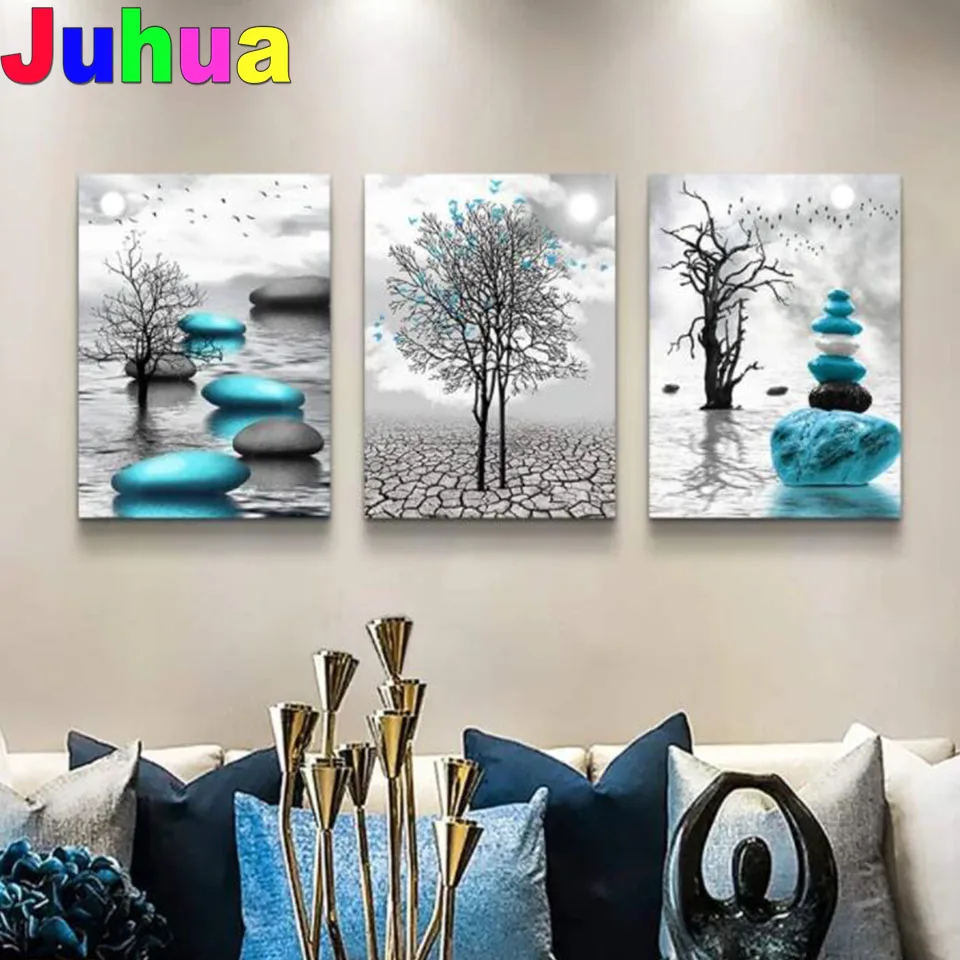 Вышивка крестом Алмазная картина Триптих, абстрактный синий камень дерево полный квадратный круглый Алмазная вышивка мозаика 3 шт., наклейка на стену