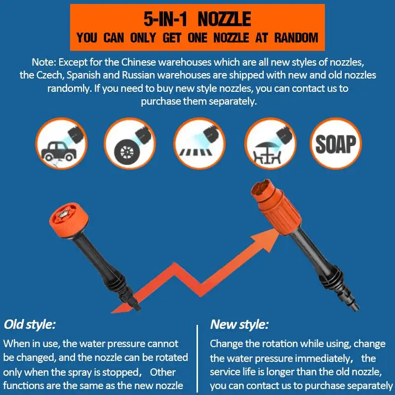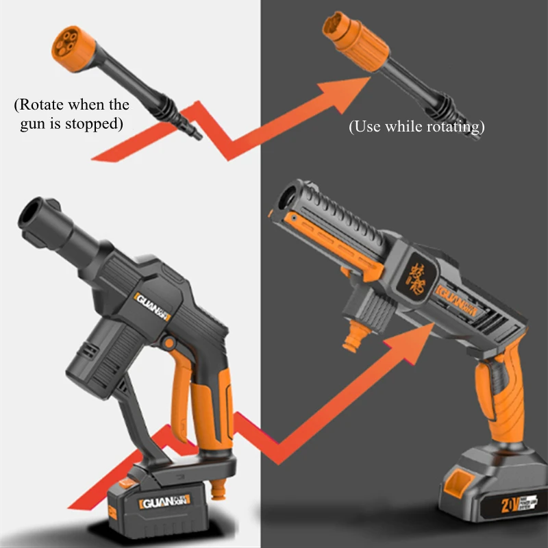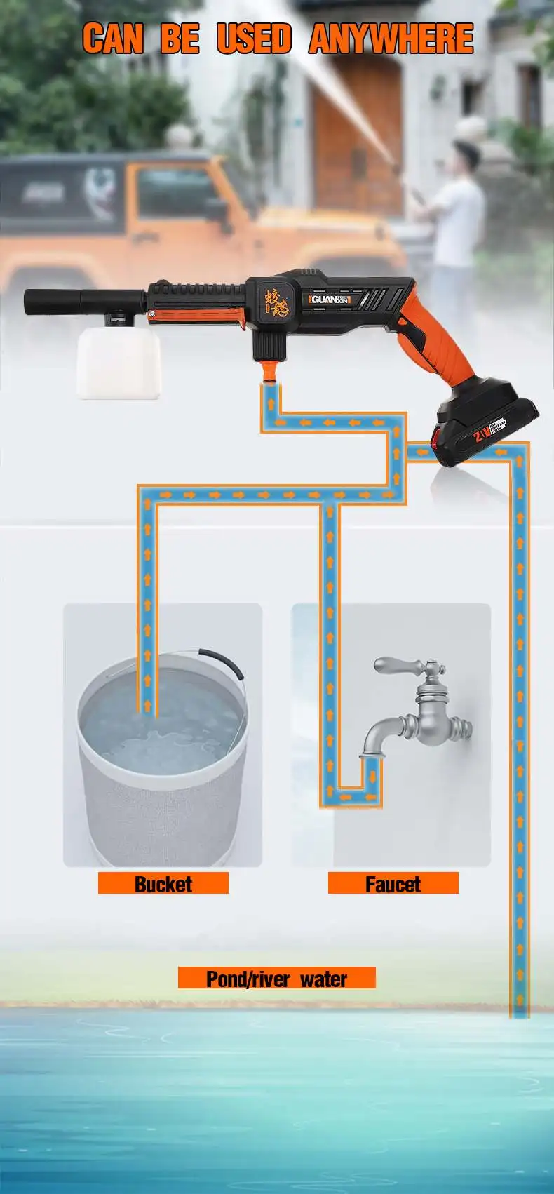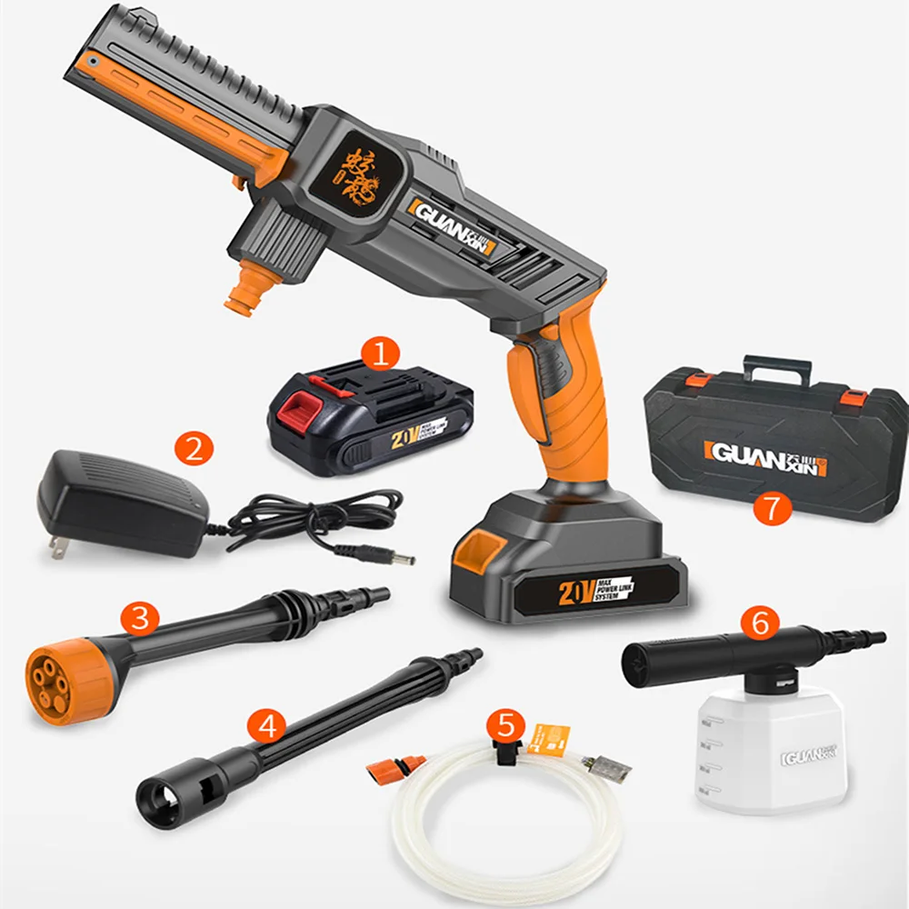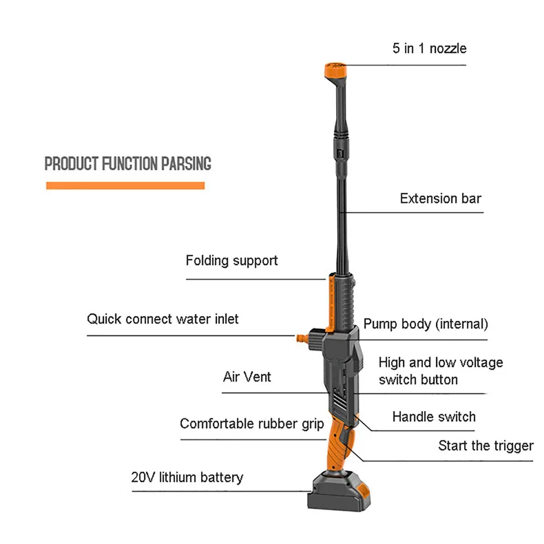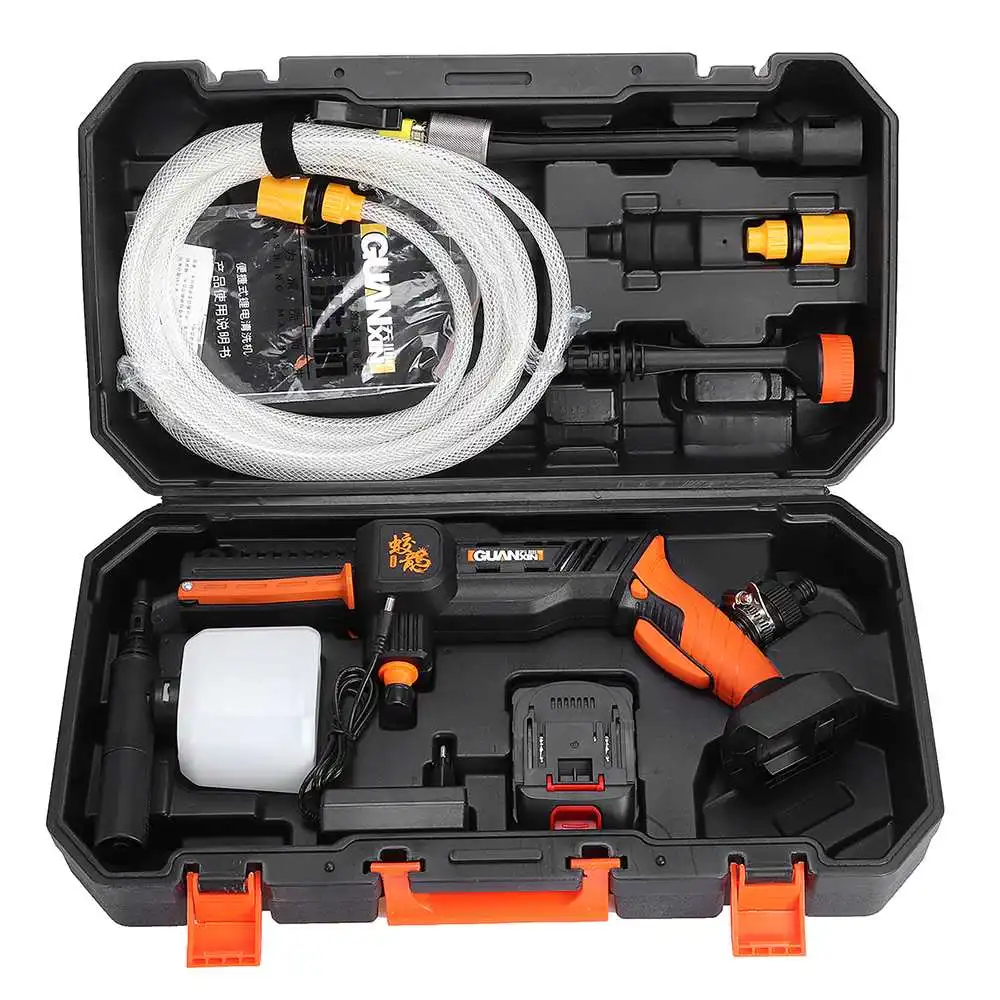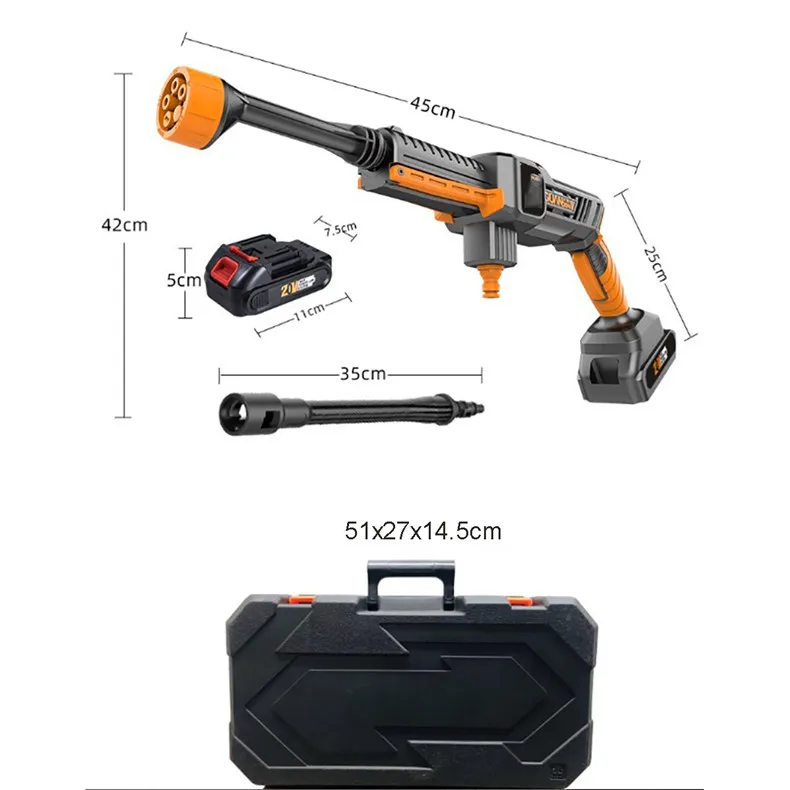 Цвет Оранжевый Материал Нейлон + ABS Напряжение 20 в Мощность 300 Вт Давление Продукта 24 бар ~ 70 бар Давление Продукта 348PSI ~ 1015PSI Поток воды 3,5 л/мин Высота поглощения воды До 1,5 м Напряжение зарядного устройства AC 100-240V 50/60Hz Диапазон: 6-10 метров Емкость аккумулятора: 2000 мАч Размер коробки для хранения 51x27.5x14.5cmОсобенности: