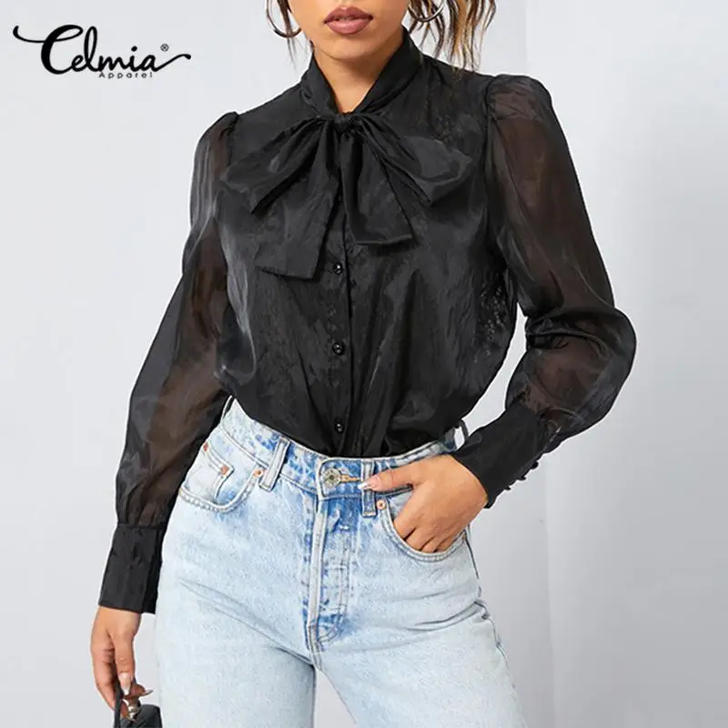 Модная сексуальная прозрачная сетчатая летняя блузка Celmia 2021, женские элегантные рубашки с бантом на шее, Кружевные Прозрачные топы с длинным рукавом