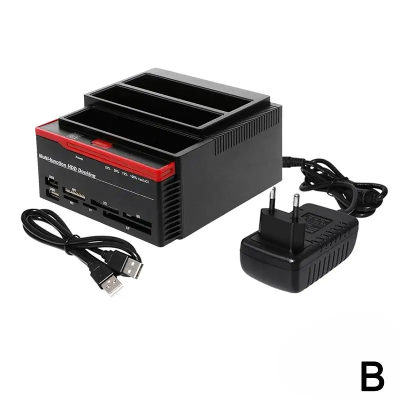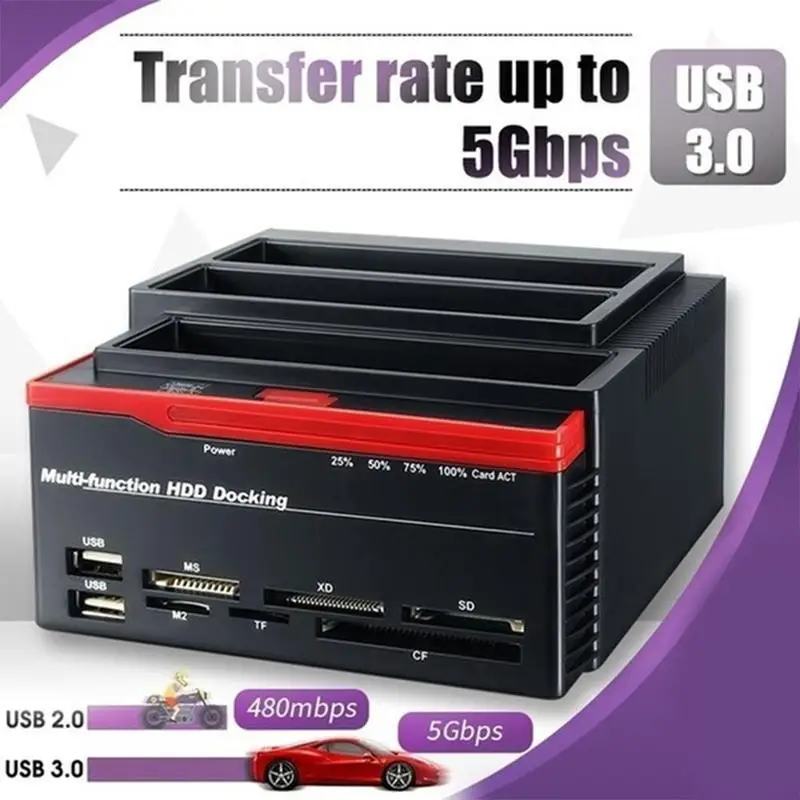 1. Универсальный внешний жесткий диск с тремя дисками,2. Непосредственно Подключите голый диск, не нужно устанавливать, прост в использовании.3. Поддержка 2,5 дюймов и 3,5 дюйма IDE/SATA жёсткий диск4. Поддержка 2,5 дюймов и 3,5 дюймов SATAI / II / III жёсткий диск, входная мощность: постоянный ток/12V.5. Интерфейс USB3.0 _ AF, скорость передачи данных USB3.0 до 5 Гбит/с6. Скорость передачи данных USB2.0 до 480 Мбит/с7. Одновременного чтения двух жестких дисков (6 ТБ * 2), два USB2.0 концентратор расширения интерфейса8. Поддержка жесткого диска, потащенного за линию копии, не подключить компьютер может быть достигнуто от, B / C диск копия на диск (B / C диск должен быть меньше или равен диск) скорость копирования до 70-100 Мб/с зависит от скорости жесткого диска)9. Поддержка слота M2 / MS / TF / SD / MMC / MS / CF / XD (карта памяти Max64GB)10,12 в/3A независимый источник питания, сильный источник питания, достаточная стабильность источника питания.11. Поддержка: windows 2000 / XP / Vista / Win7 / 8; Linux / MAC OS12.WinXP максимальная поддержка 2 ТБ, Win7 / 8 до 3 ТБ или большеПосылка включает в себя: Корпус * 1Адаптер питания 12V / 3A * 1Кабель для передачи данных 3,0*1Руководство * 1