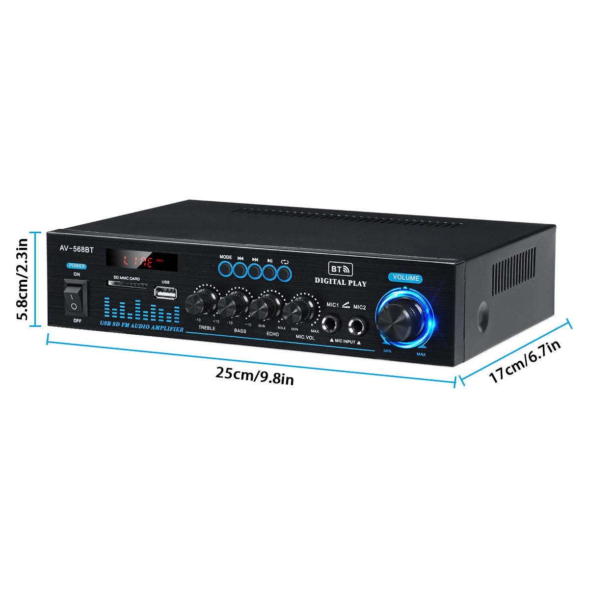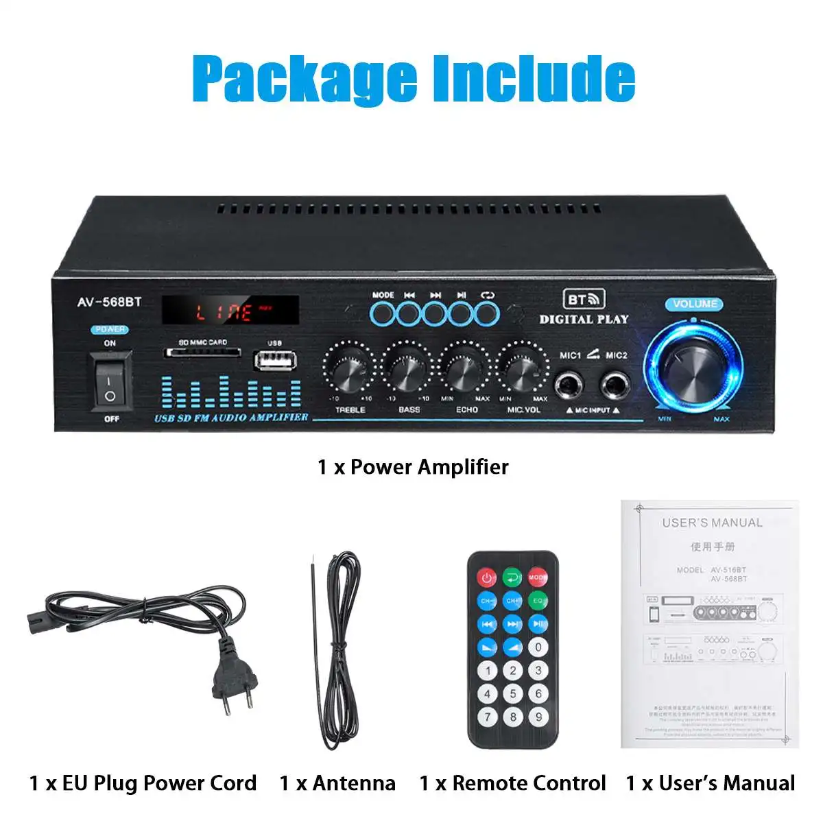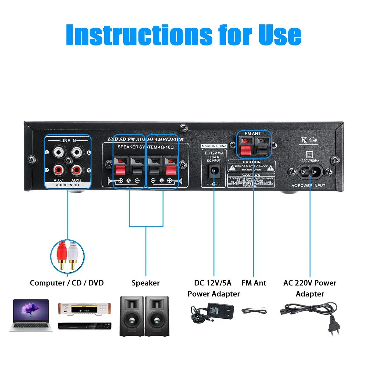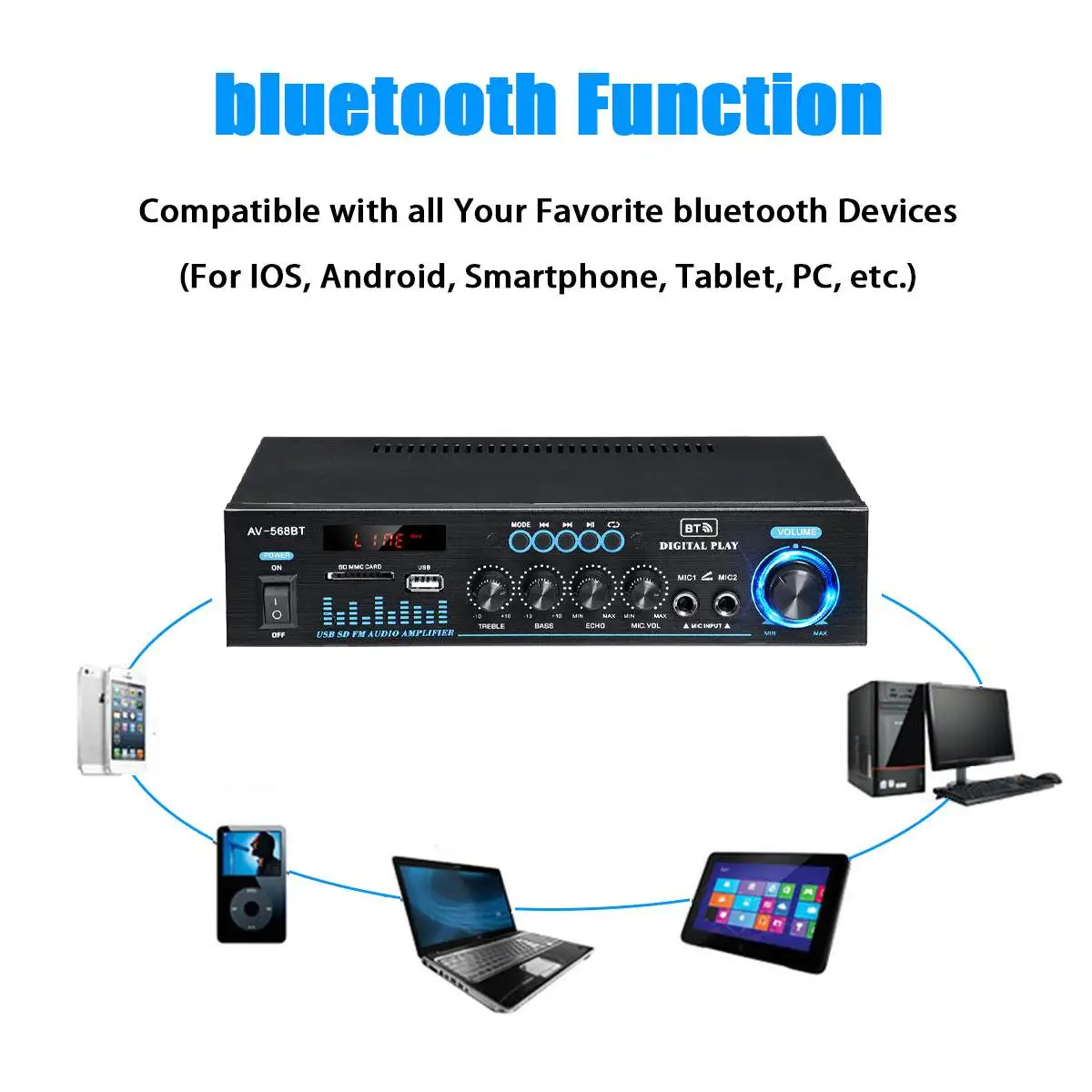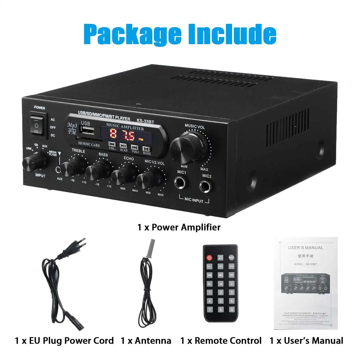 Особенности:-Цифровой mp3-плеер.-Интерфейс bluetooth для потоковой передачи музыки через мобильный телефон.-Слот USB / SD для воспроизведения MP3 с карты памяти или карты.-Поддержка 2 way вход для микрофона.-Поддерживает fm-стерео радио.-С высокими частотами, басами и регулятором громкости, очень прост в использовании.-Низкое Искажение обеспечивает более четкий, сильный и мощный звук.-2 канальный выход.-С функцией дистанционного управления.-Питание постоянного/переменного тока, подходит для домашнего использования.-Подходит для HiFi, систем домашнего кинотеатра и караоке.