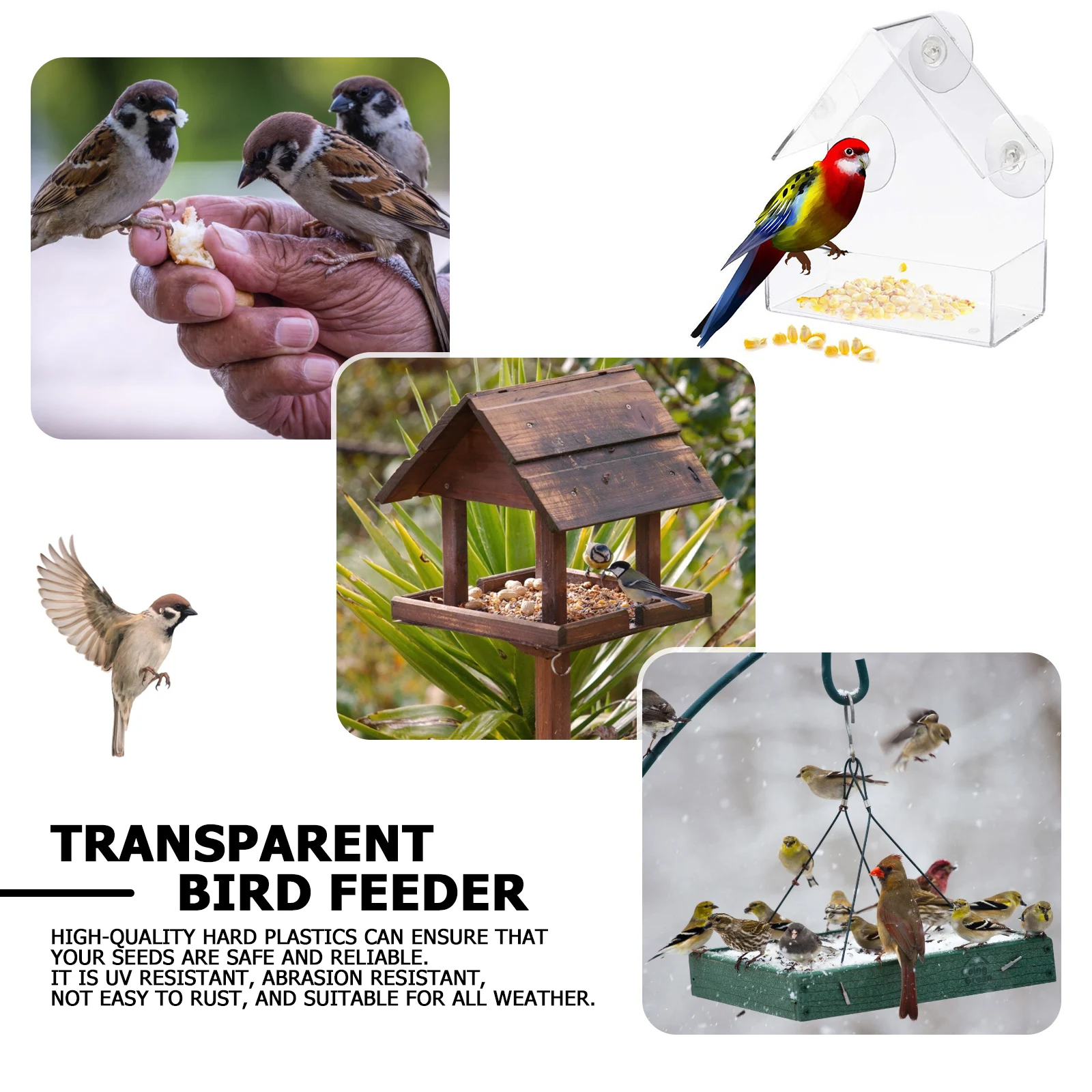 Кормушка для птиц изготовлена из высококачественного пластика, который является прочным и прочным. Высококачественный жесткий пластик гарантирует безопасность и надежность ваших семян. Он устойчив к ультрафиолетовому излучению, устойчив к истиранию, не подвержен ржавчине и подходит для любой погоды.