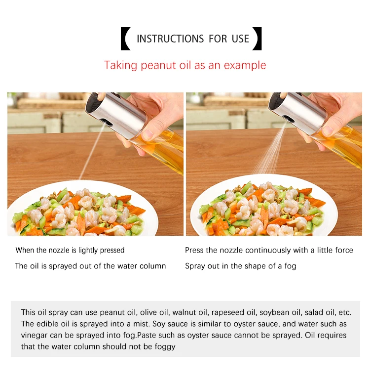 Распылитель масла для приготовления пищи изготовлен из высококачественной нержавеющей стали 304 и с большой площадью нажмите кнопку, легко нажимать и контролировать дозировку, противоскользящий дизайн с волнистыми полосками; С насадкой, скрывающей внутри колпачка, от пыли. Который имеет противоскользящий дизайн сверху