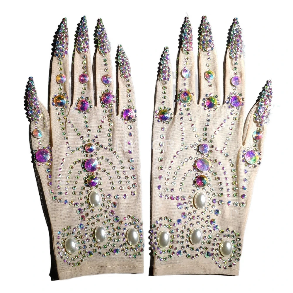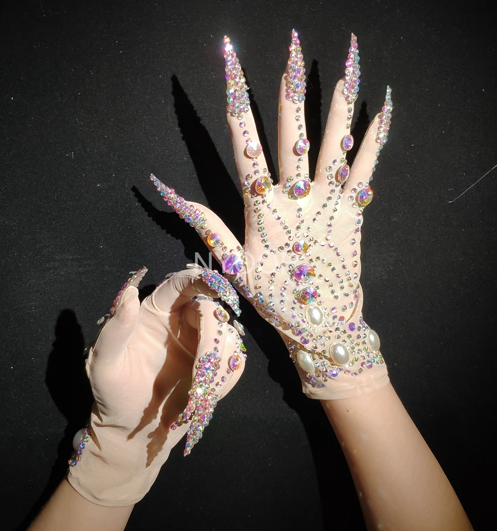 Роскошный Кристалл AB Стразы варежки с перламутровыми бусинами; Женская модная обувь с украшением в виде кристаллов Короткие перчатки сопротивления и ночных клубов, для выступлений на сцене шоу аксессуары