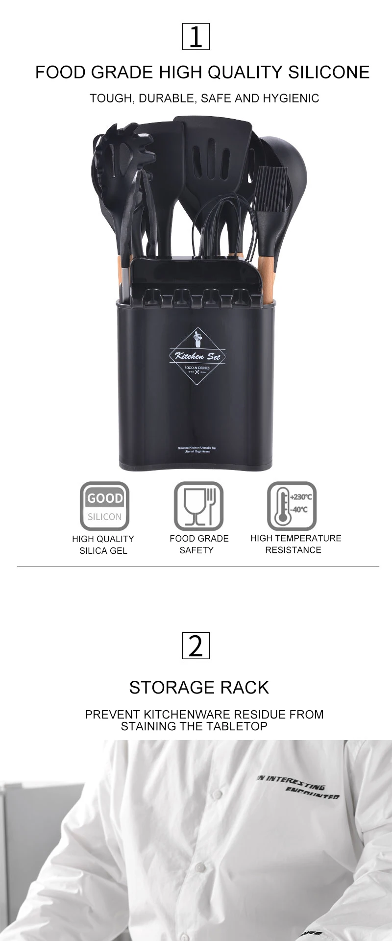 посуда для кухни посуда для кухни Набор силиконовых кухонных принадлежностей, 13 шт., Бочка, плоская деревянная ручка, посуда, набор инструментов для приготовления пищи с хранением, аксессуары для кухонных инструментов