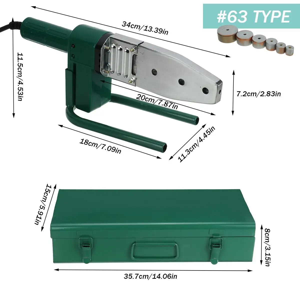 #63 тип спецификацииМатериал: АБС + алюминийЦвет: зеленыйМощность: 800 ВтПодходит для: PPR / PB / PE трубТемпература нагрева: 280 ℃(536 ℉)Сварочная головка: 20 мм/25 мм/32 мм/40 мм/50 мм/63 ммНапряжение:220v(Пожалуйста, убедитесь, что он подходит для вашего местного стандарта напряжения!)Тип штепсельной вилки: штепсельная вилка CN (мы вышлем вам штепсельную вилку локального адаптера для использования)