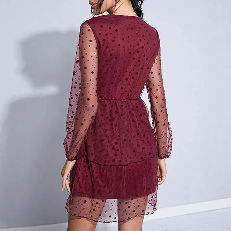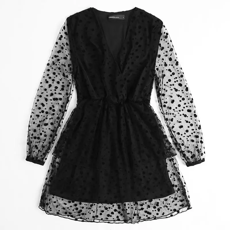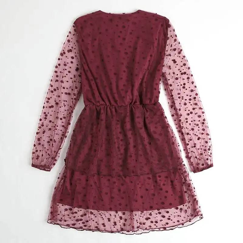 Детали продукта:-Длина рукава: рукав с девятью точками-Вырез: v-образный вырез-Узор: однотонный-Длина: короткий стиль-Украшение: сетка в горошек-Особенности: Короткое облегающее платье в горошек с V-образным вырезом в европейском и американском вечерние ле-Толщина: тонкая