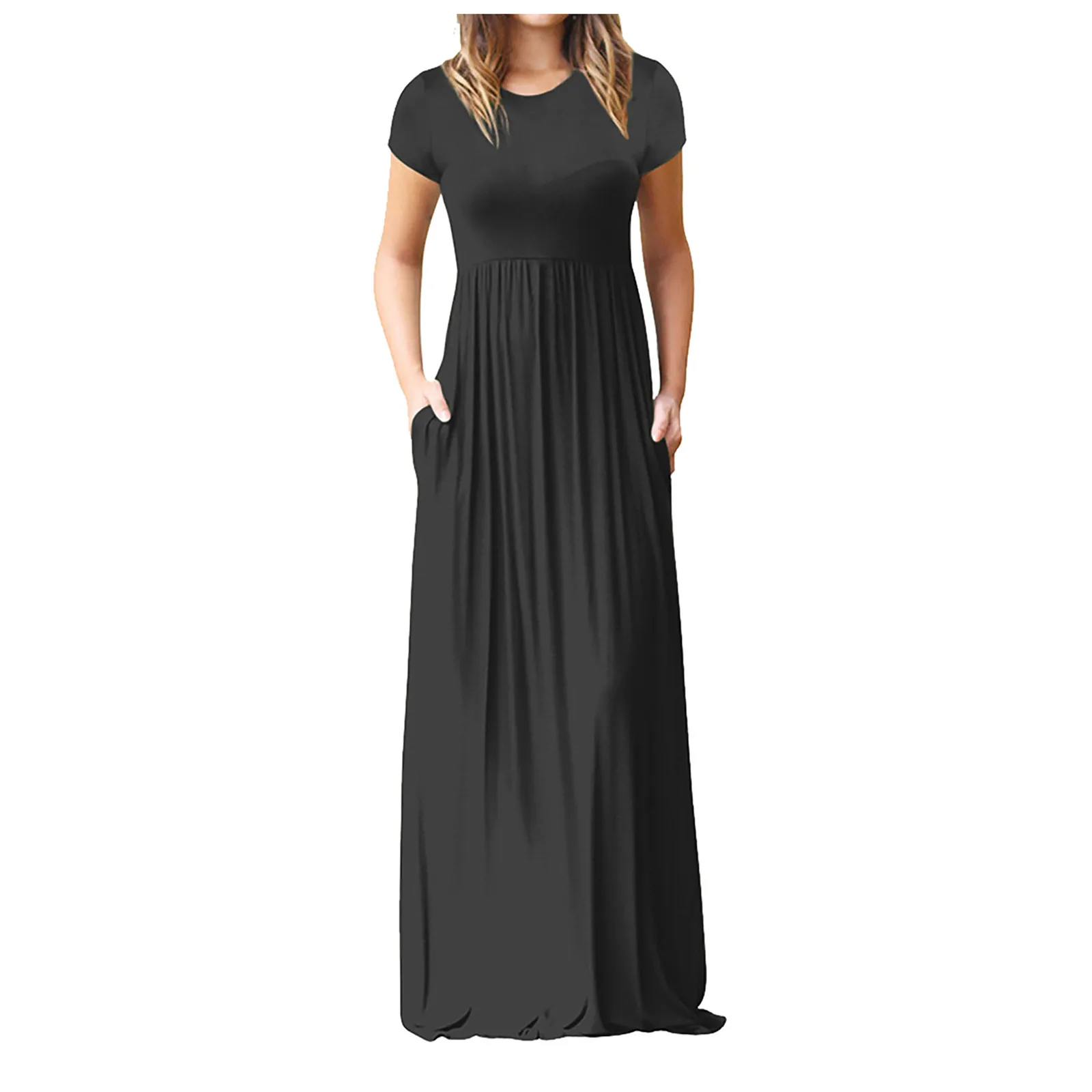 Женское платье с круглым вырезом, Повседневная элегантная однотонная обувь для вечеринок; Элегантная карманы короткий рукав макси платье Летнее пляжное платье размера плюс свободные однотонные вечерние платья