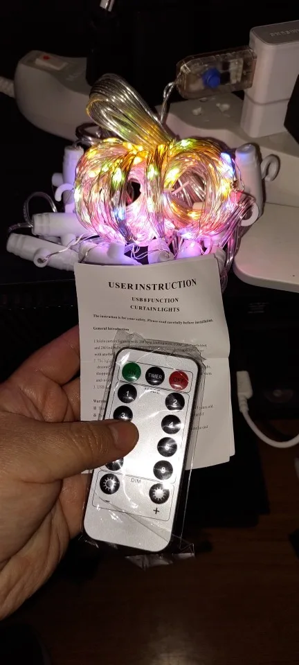 Очень яркая гирлянда-занавеска!!! Работает от зарядки USB, несколько режимов на самом коннекторе. Удобство в том, что есть крючки для крепления на багету.