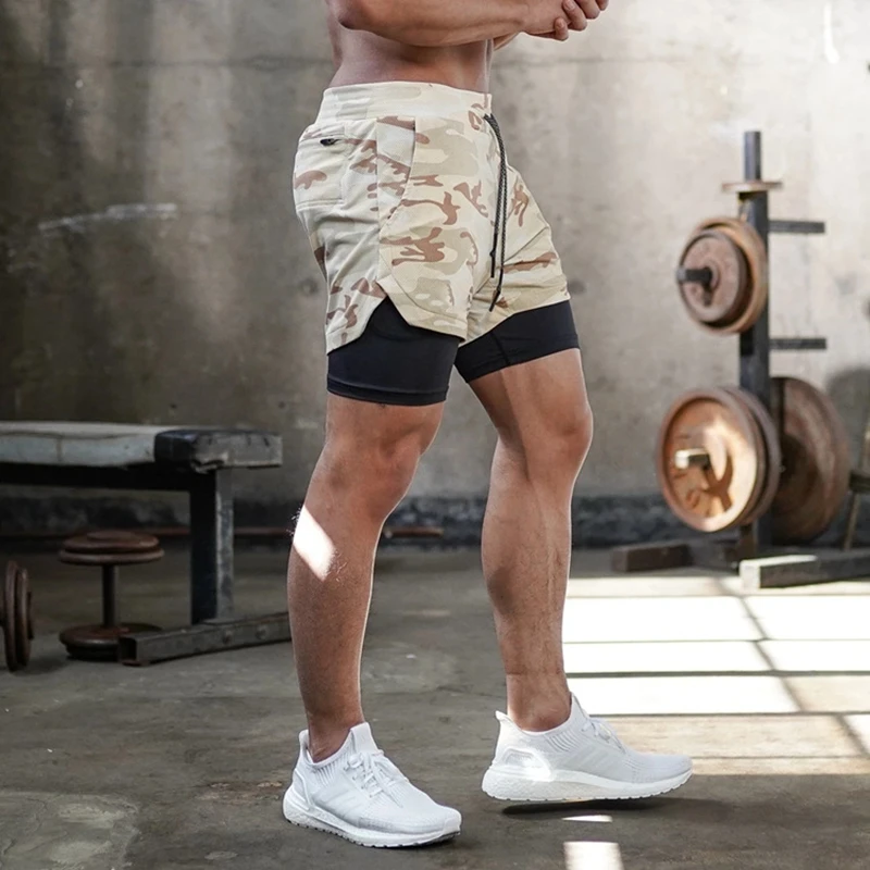 Новинка 2021, камуфляжные шорты для бега, мужские двухслойные быстр...