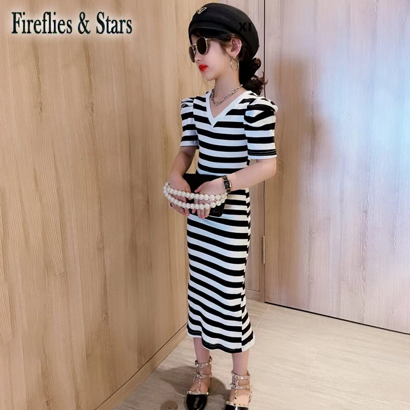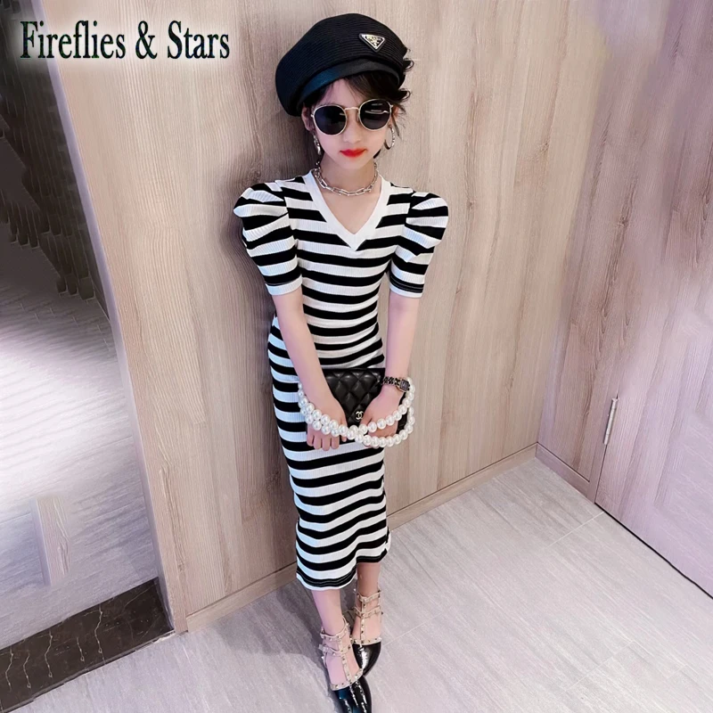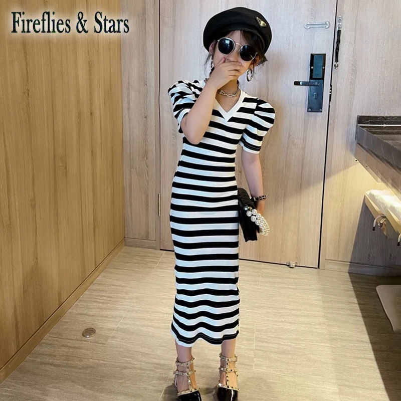 Название:Летнее Длинное Платье для девочек; Детское трикотажное платье; Vestidos; Детская одежда в полоску с разрезом сзади; Обтягивающие платья с пышными рукавами для детей от 4 до 12 лет