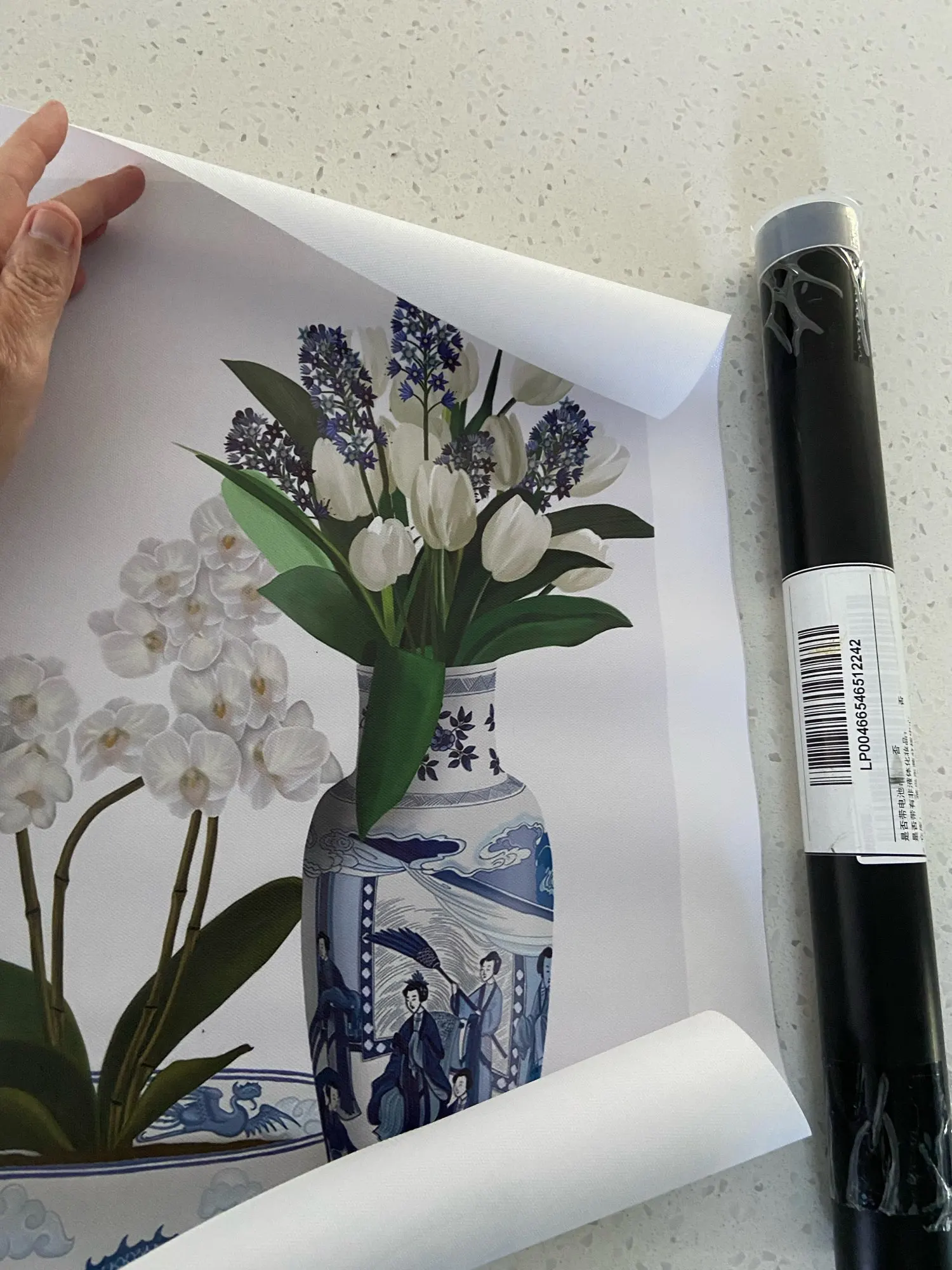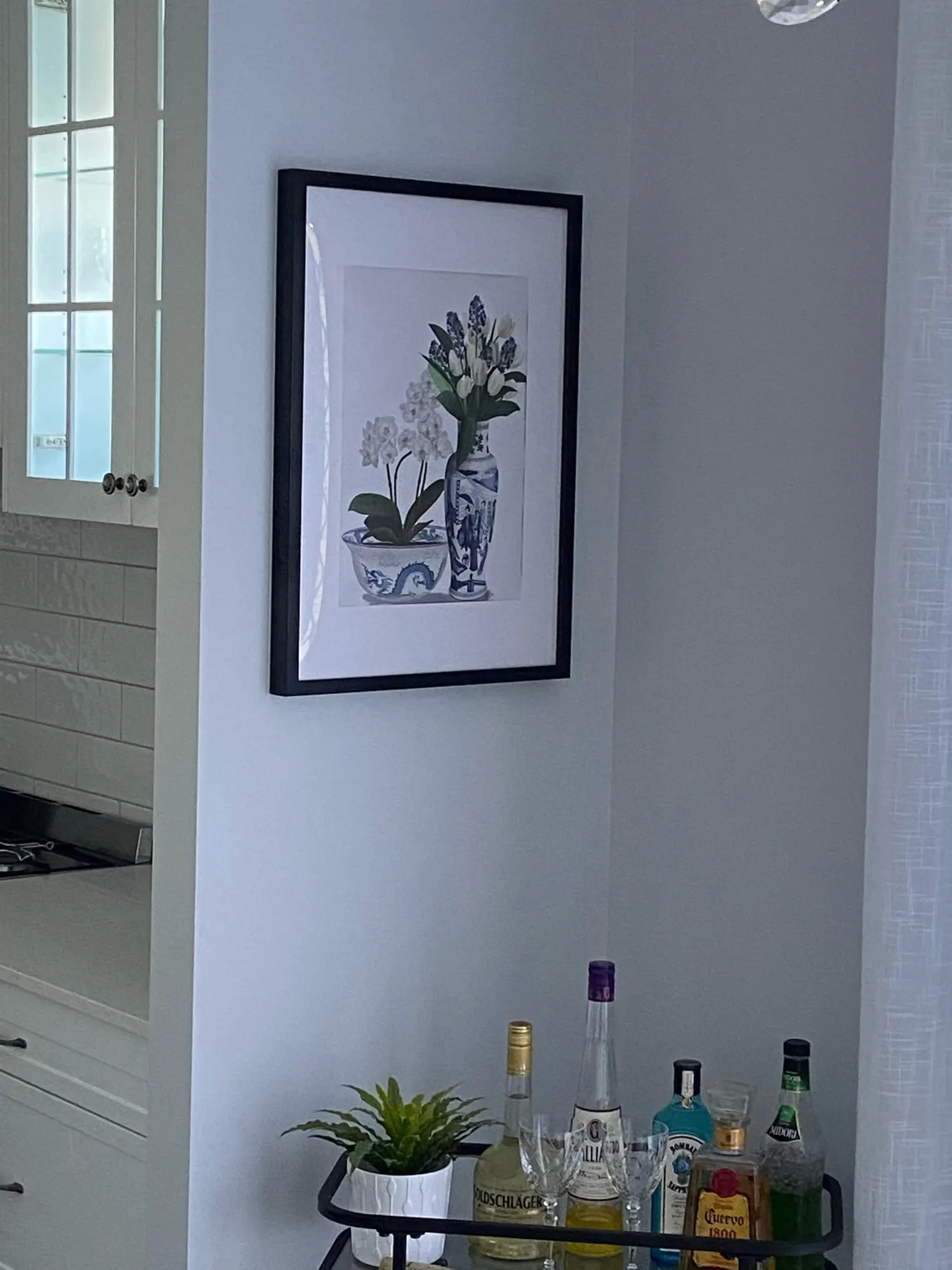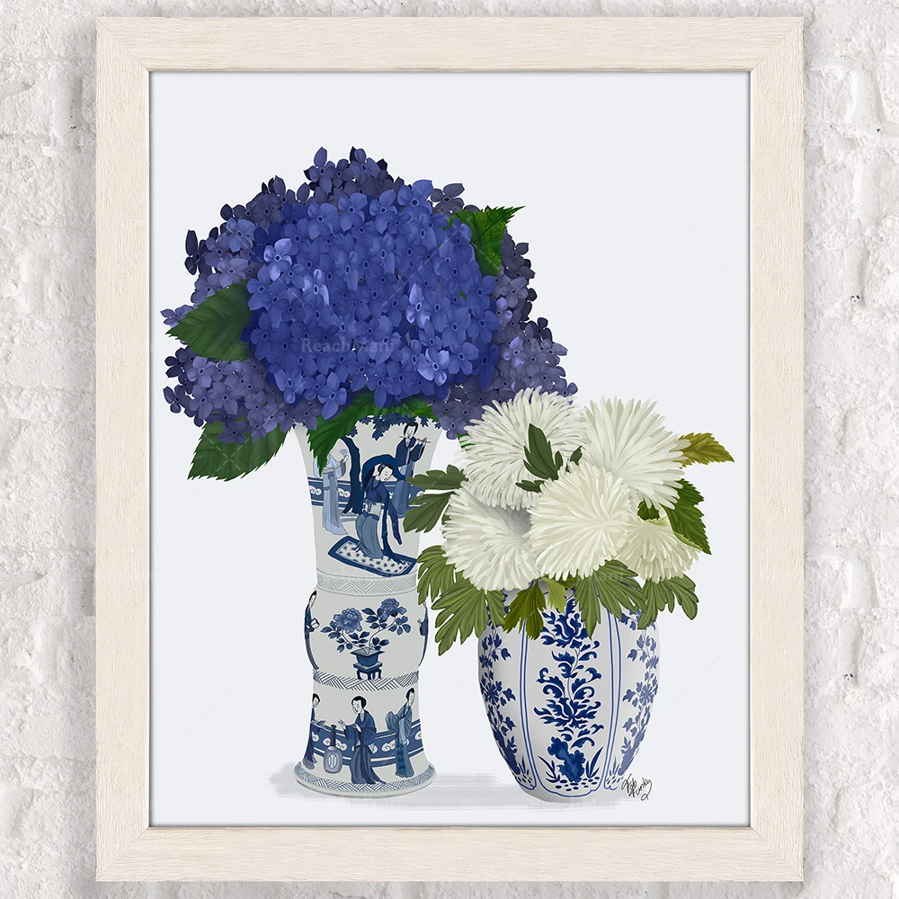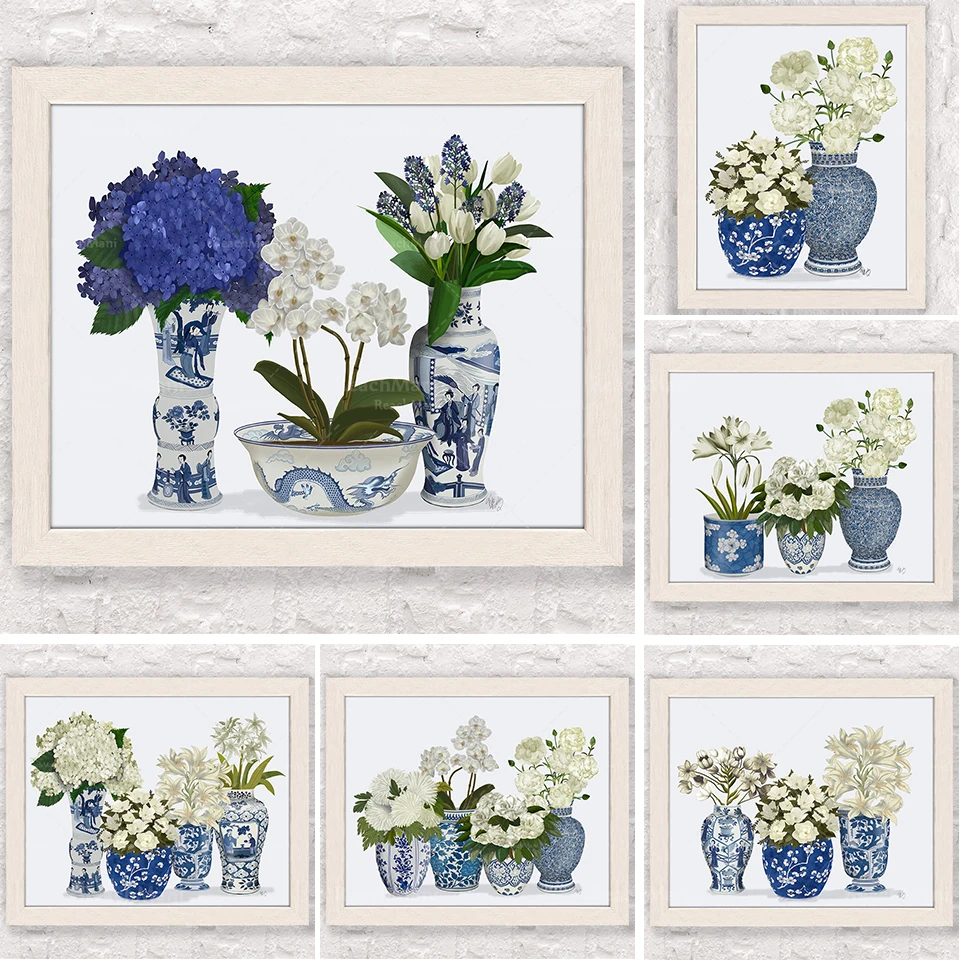 С рисунками в китайском стиле (шинуазри) и искусство, белого и голубого цвета, Китай (материк), ботанический декор, китайская ваза, хамптонс стиль, цветочные репродукции, гортензии, Орхидея, тюли