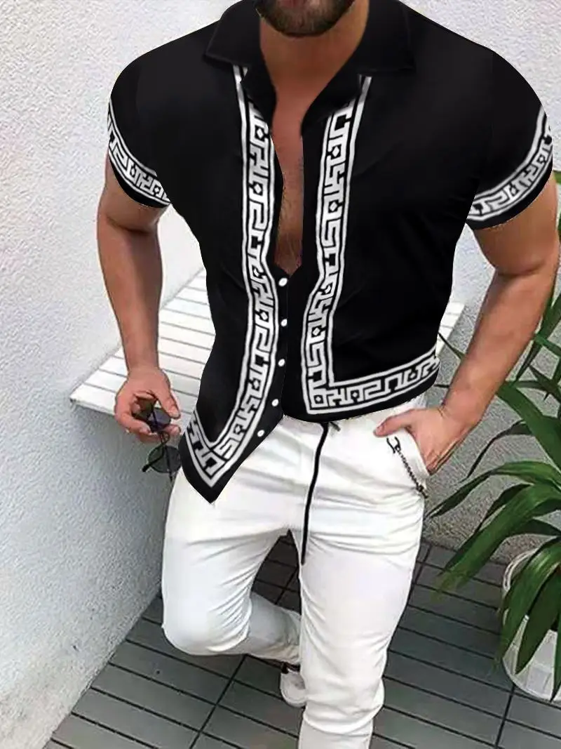 Рубашка мужская с этническим принтом, воротником-стойкой и короткими рукавами