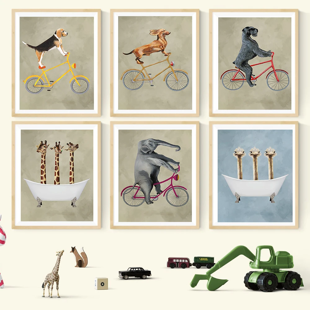 Скандинавская Картина на холсте с мультяшными животными, настенная живопись, велосипед, собака, жираф, страус в ванне, плакат для декора детской комнаты, картины