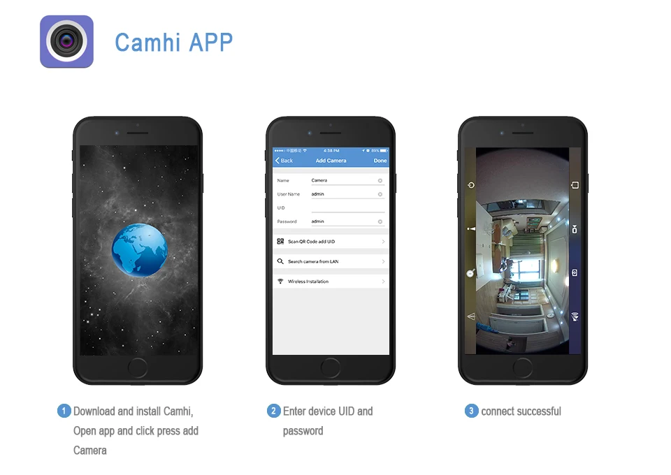 ① Загрузка и установка Camhi. Откройте приложение и нажмите кнопку, чтобы добавить камеру.② Введите идентификатор устройства и пароль.③ Подключение успешно.