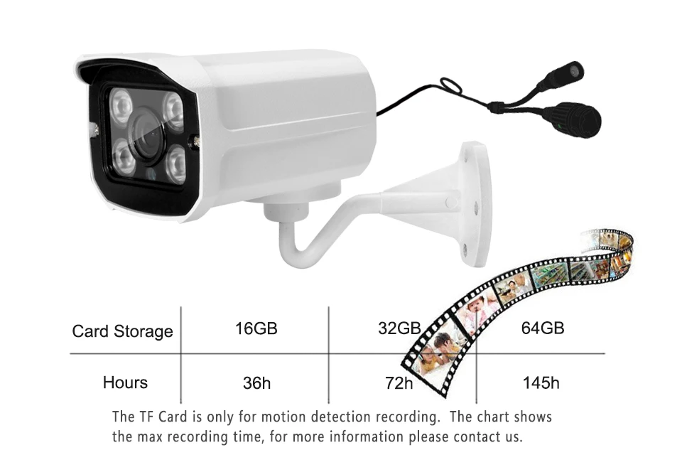 В камере есть слот для TF-карты (до 64 Гб опционально), и TF-карта будет записывать при срабатывании обнаружения движения.Внимание: TF-карта предназначена только для записи при обнаружении движения. В таблице указано максимальное время записи, для получения дополнительной информации свяжитесь с нами.