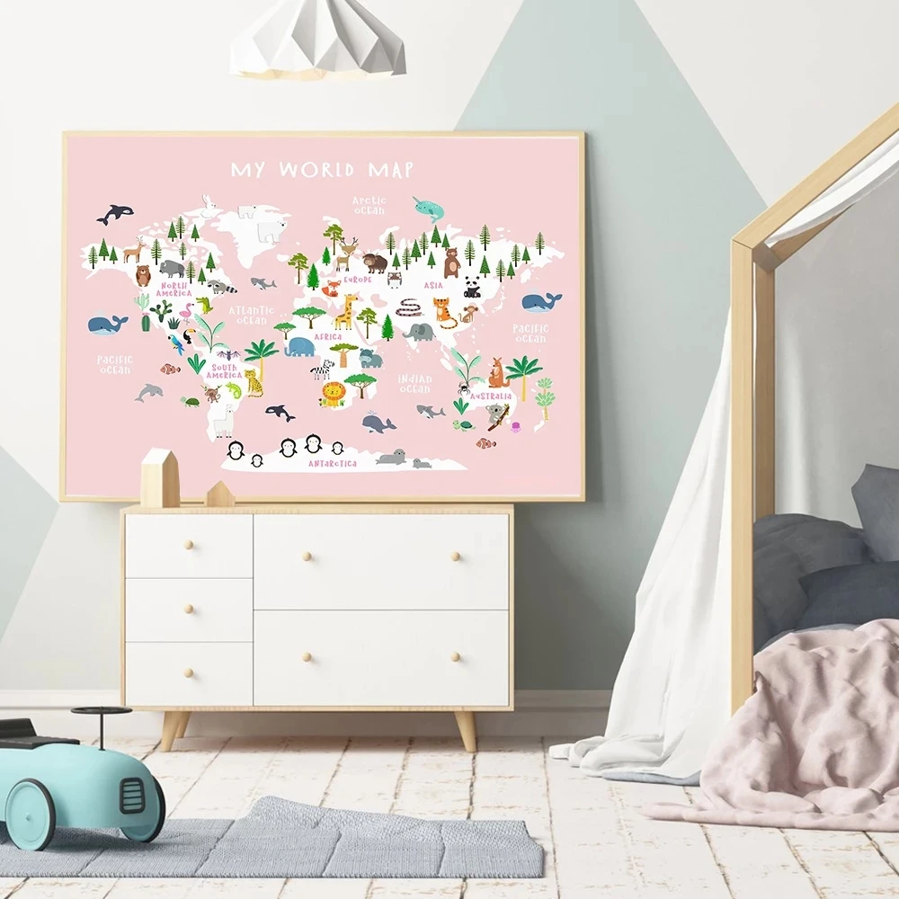 Настенный постер для детской комнаты, печать животных, карта мира, ...