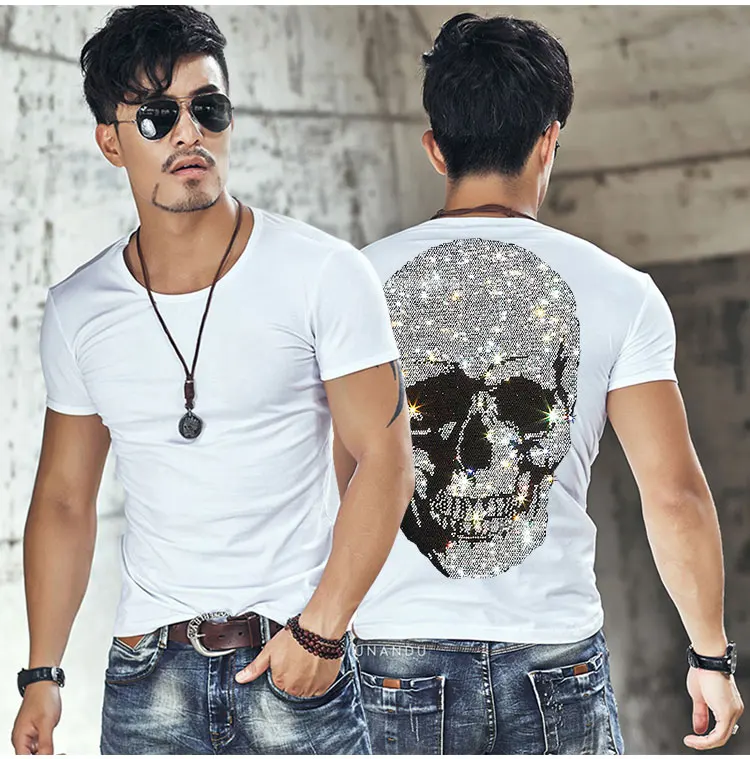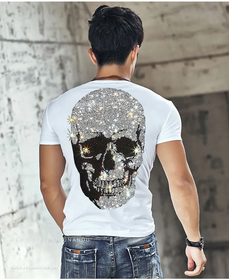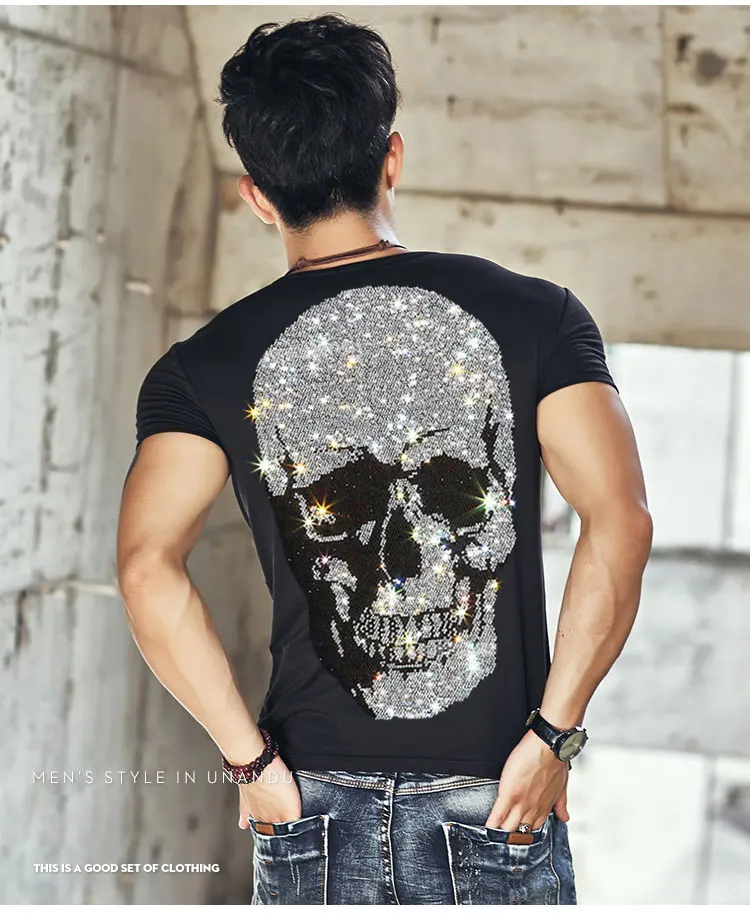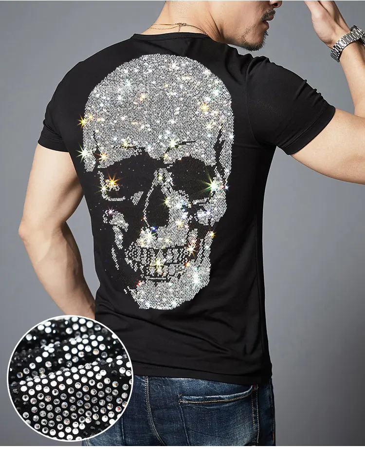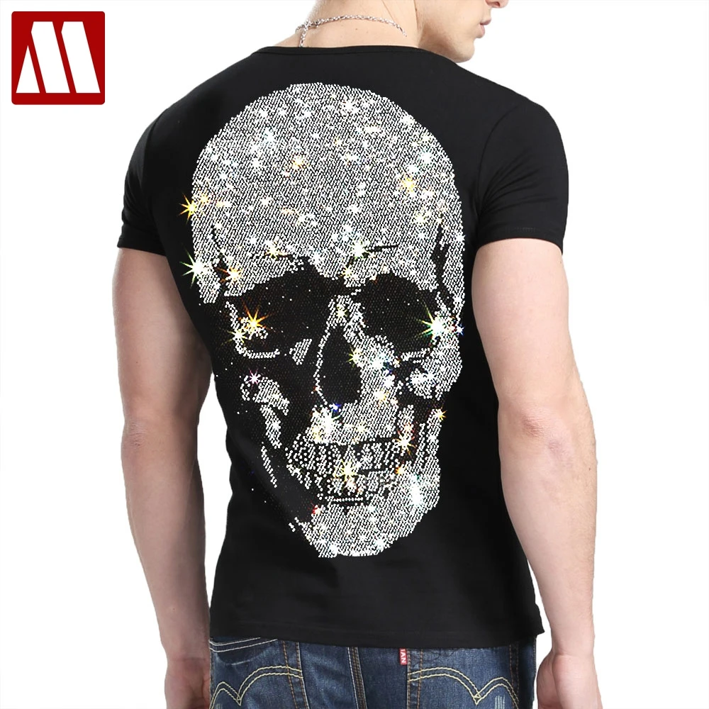 В стиле хип-хоп Стразы футболка для мужчин с принтом череп, уличный стиль Харадзюку Хай-стрит хлопковая футболка с коротким рукавом больших размеров Летние черные топы