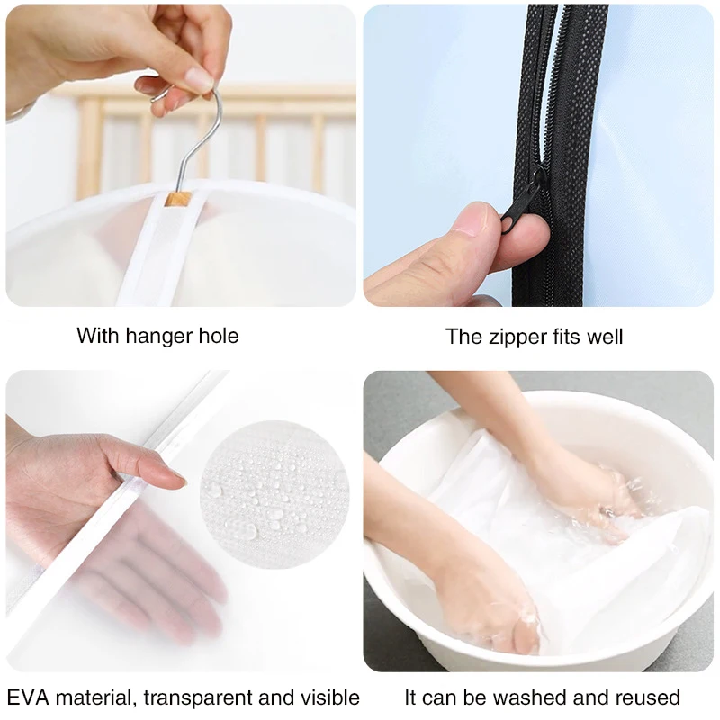 Размер: S60 * 80 см M6O * 100 см L60 * 120 см XL6O * 14ocmВведение продукта: используется материал EVA.Материал имеет водонепроницаемую функцию. Это своего рода пластик, поэтому пылезащитный мешок может быть очищен и вытерт, и имеет хорошую durab-ility.After использовании, он может держать одежду чистой и аккуратной