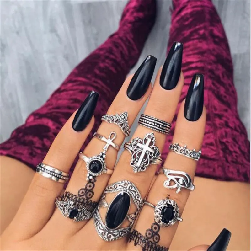 11 шт. кольцо в готическом стиле, набор, черный браслет из оникса, распятие ювелирные изделия, бралет 'Злой Глаз' инди, складные перегородки, набор колец, Midi, массивные кольца, подарок # XJ30D