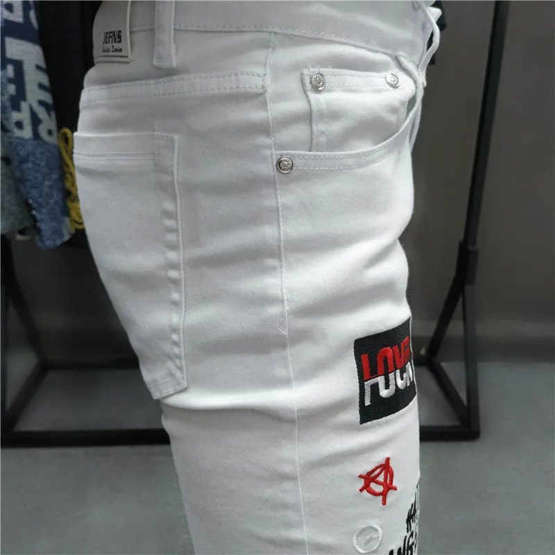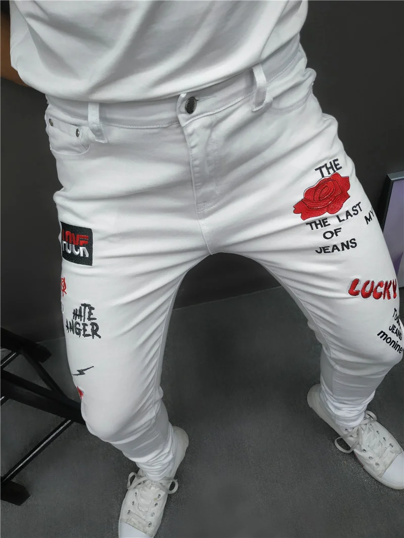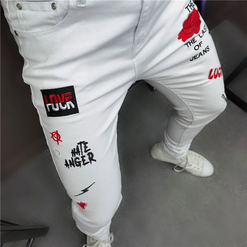 Белые джинсы, Мужские Стрейчевые зауженные джинсы с надписями, забавные джинсы, 2021, вечерние повседневные уличные модные джинсы с вышивкой розы для мужчин