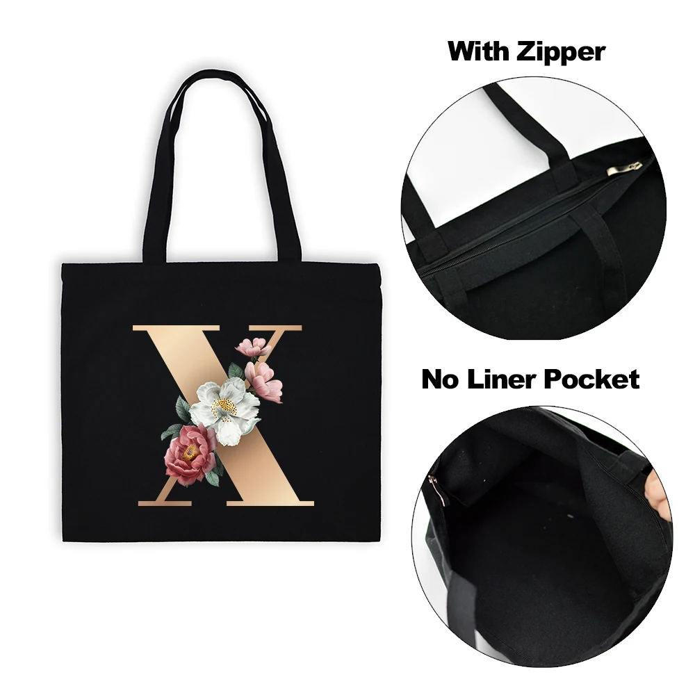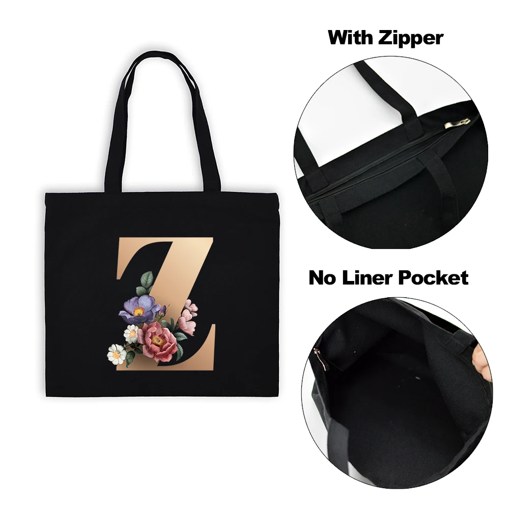 Цветочный алфавит A-Z на молнии Холст Tote сумки многоразового использования для покупок сумка на плечо сумка для хранения Высокая емкость Bachelorette вечерние ПодарочныеМатериал: холст/хлопок