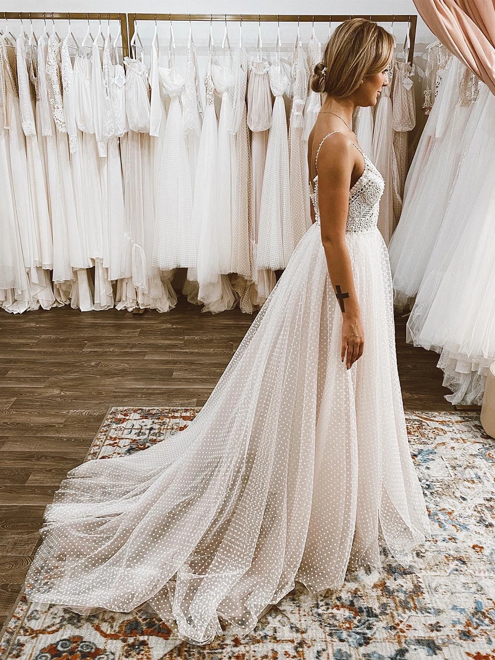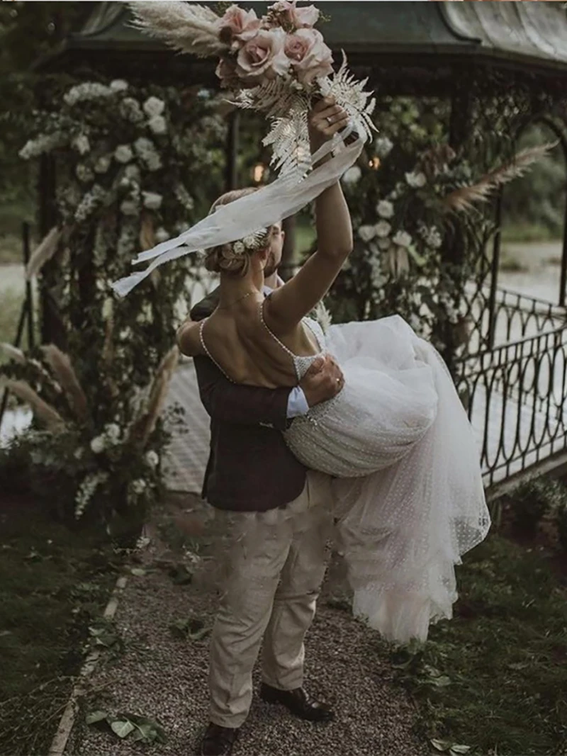 Пляжное свадебное платье в горошек, Тюлевое платье принцессы на бретельках с V-образным вырезом и открытой спиной, кружевное платье с вырезом