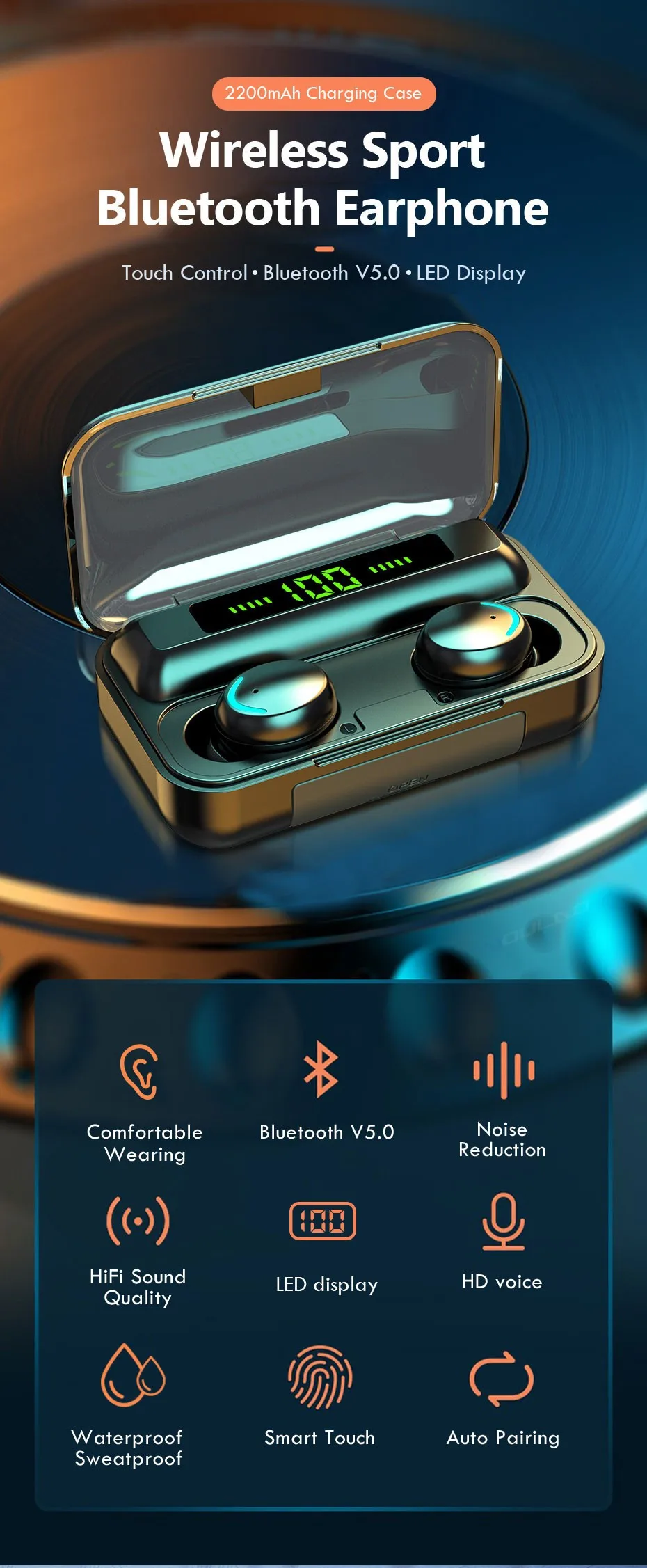 Bluetooth-наушники TWS 5,0, 2200 мА ч, беспроводные, водонепроницаемые