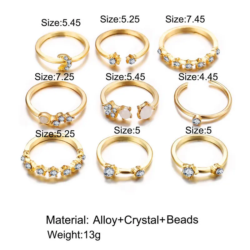 Набор колец с золотыми кристаллами, Луной и звездой, 9 шт.компл.