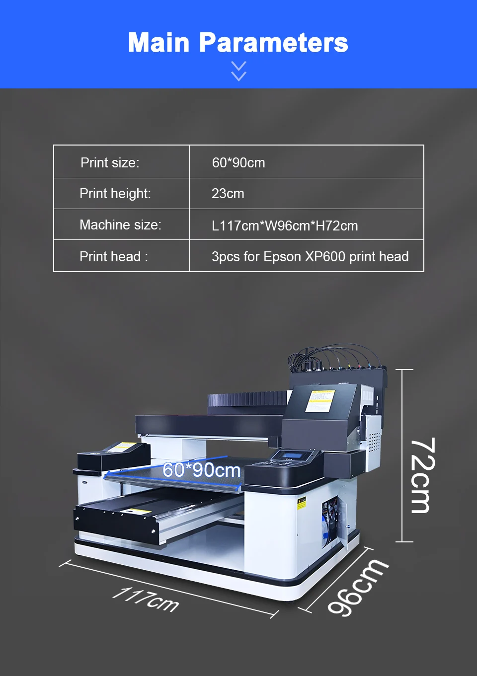 UV6090 оснащен тремя печатающими головками XP600 для EPSON, скорость печати примерно в 3 раза быстрее, а печать имеет более высокую четкость и более красочную. Более того, инфракрасное Автоматическое Измерение высоты позволяет отрегулировать лучшее расстояние печати, чтобы защитить печатающую головку от столкновения.