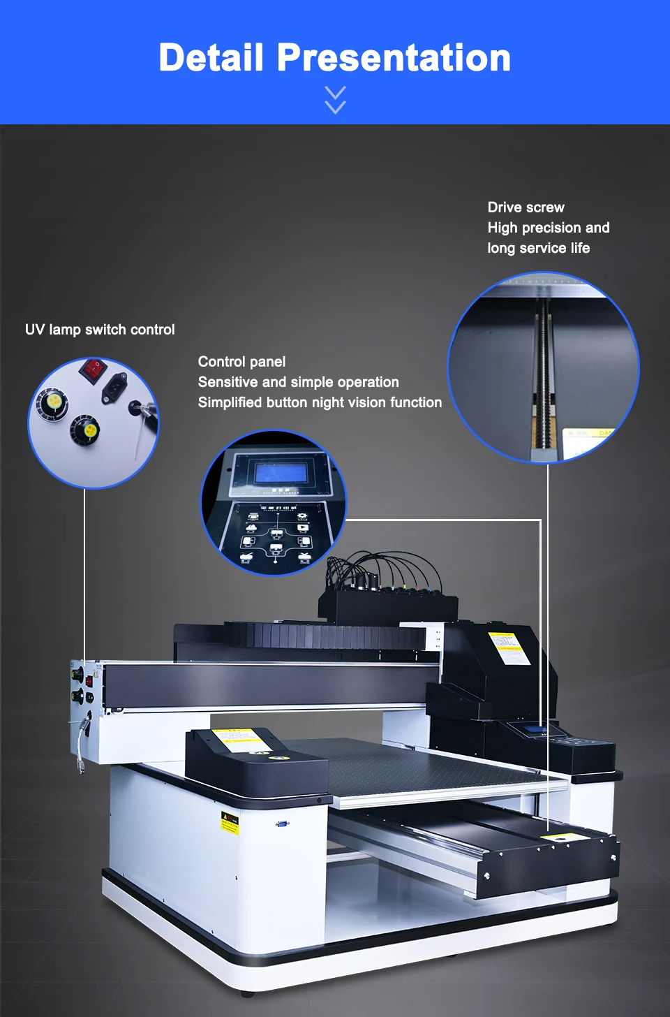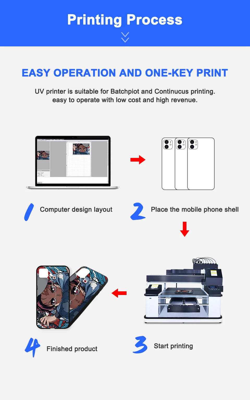 Простота в эксплуатации и одноклавишная печать, которая делает УФ-принтер подходящим для пакетной и непрерывной печати с низкой ценой и высоким доходом.