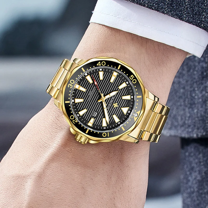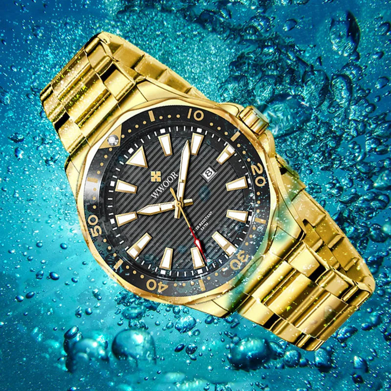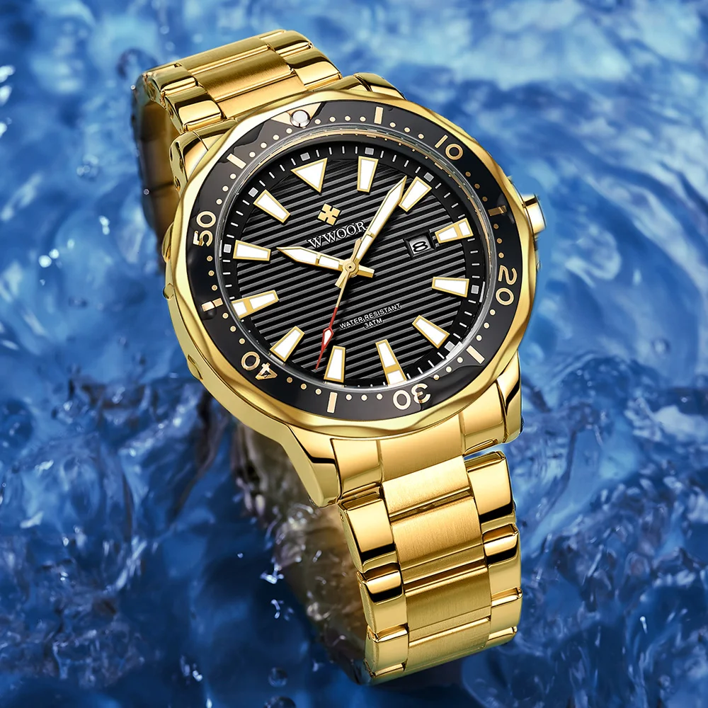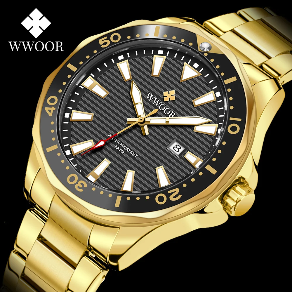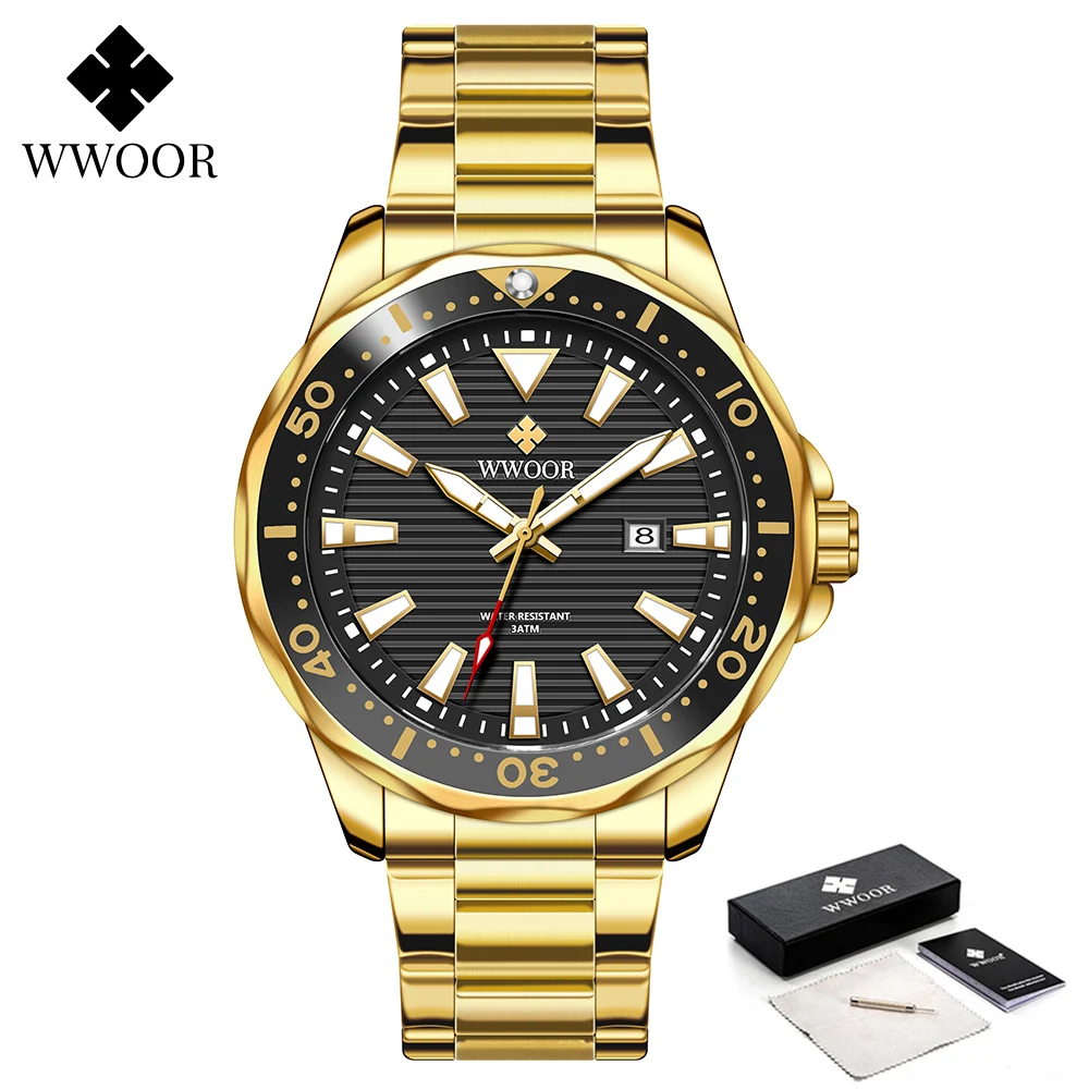 Новинка 2021, Креативные мужские часы WWOOR от лучшего бренда, роскошные спортивные золотистые кварцевые часы для дайвинга, мужские военные водонепроницаемые светящиеся наручные часы