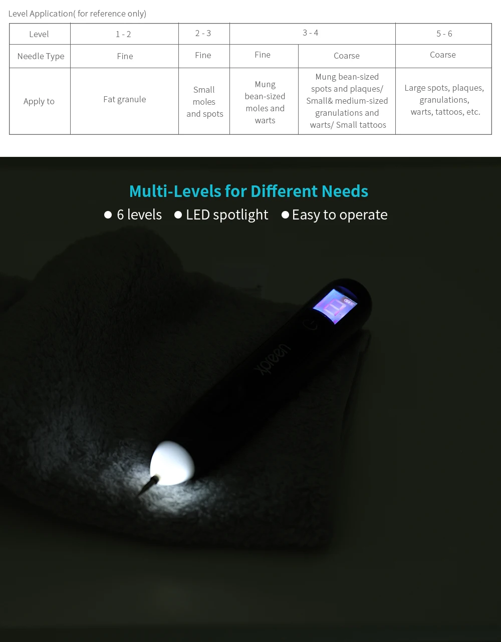 Его можно использовать для удаления родинок, темных пятен, бородавок, verruca filiformis, мозолей, verruca plana, жировых гранул, verruca plantaris, шприцов и т. д.