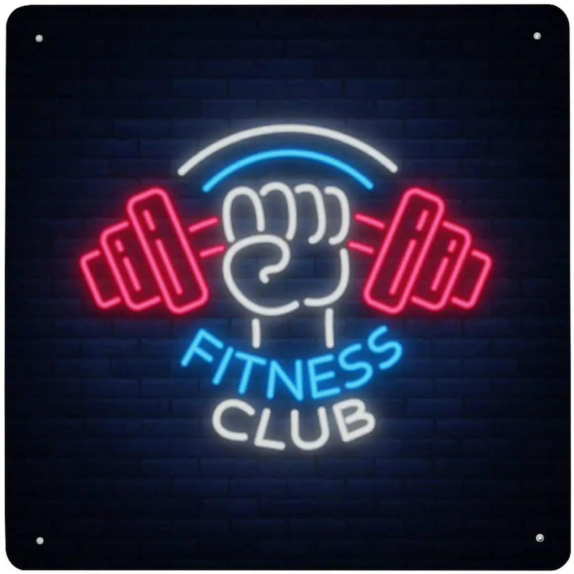 Металлическая жестяная вывеска с логотипом для фитнеса, тренажерного зала, неоновый стиль, изоляция вектора, металлическая жестяная вывеска, ретро, для дома, кухни, офиса, сада