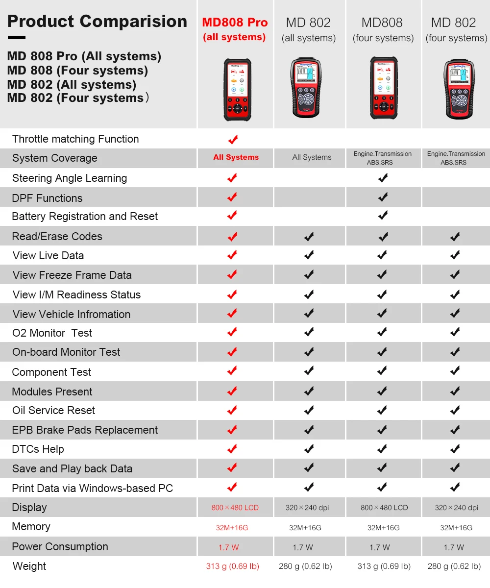 1. MD808 PRO-это обновленная версия MD808 и MD802, которая охватывает все больше автомобилей и больше систем.2. MD808 PRO Поддержка обучения рулевым ангелом, функции DPF, регистрация и сброс батареи.3. MD808 PRO обновленная версия MD802, охватывает больше автомобилей и больше систем. Поддержка считывания/очистки кодов и функций данных в режиме реального времени для всех систем, считывания и очистки кодов неисправностей, управления и тестирования BMS/сброса масла/SRS/EPB/DPF систем, всех протоколов OBD II, все 10 режимов тестирования и Улучшенная Поддержка режима OBD II 6.