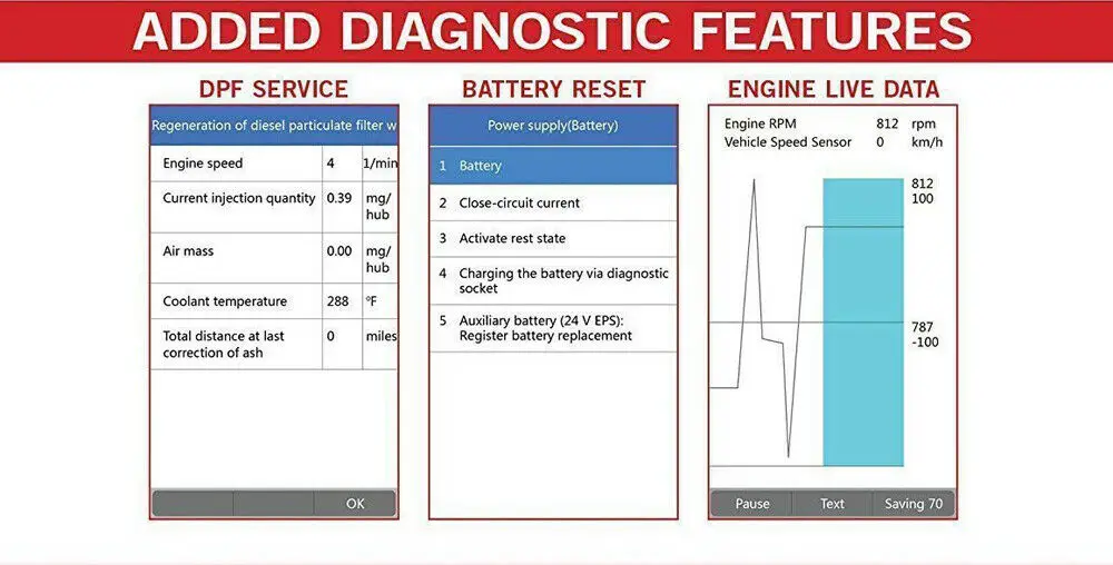 1. Сброс масла: Сброс системы жизнедеятельности масла каждый раз, когда масло и масляный фильтр изменяются;2. EPB: для поддержания безопасности и эффективности электронной тормозной системы;3. Сброс SAS: выполнение калибровки датчика угла поворота и четкие записи;4. Регенерация ДПФ: специально работает для дизельной системы сажевого фильтра с регенерацией ДПФ, замена компонентов ДПФ после замены блока управления двигателем;5. Сброс BMS: сброс блока мониторинга автомобильного аккумулятора после замены батареи или датчика мониторинга батареи;6. Повторное обучение дроссельной заслонки: Инициализация приводов дроссельной заслонки в состояние по умолчанию;7. Кровотечение из АБС: езда на велосипеде система ABS для кровотечения воздуха из системы ABS перед традиционным кровотечением.